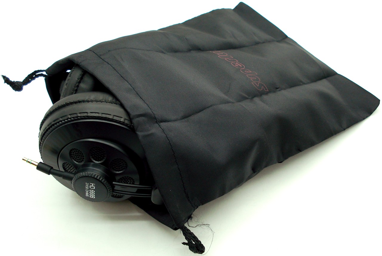 Por último, tenemos una práctica y fina bolsa, negra y resistente con cierre de cuerda para conservar y transportar los auriculares. En ella también tienen cabida los dos rollos de cable de 1 y 3 metros. Se ha empleado el cosido al hilo para bordado. Es una bolsa fácilmente plegable y difícil de arrugar, gracias al material empleado.