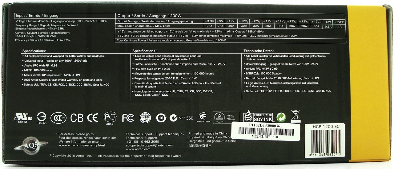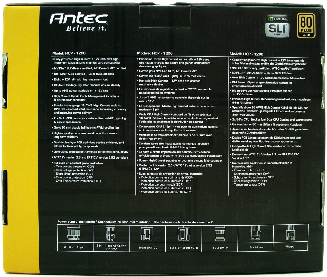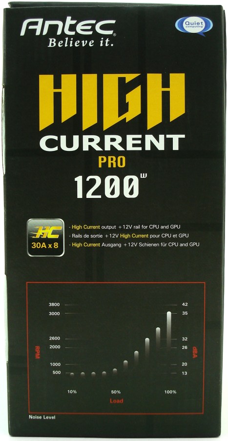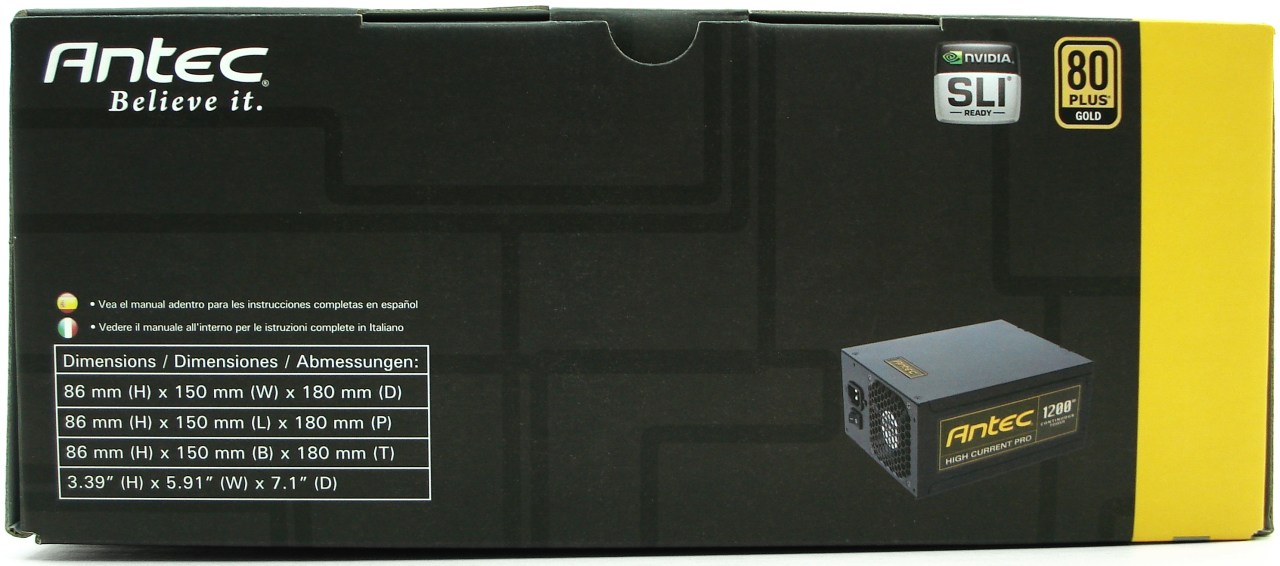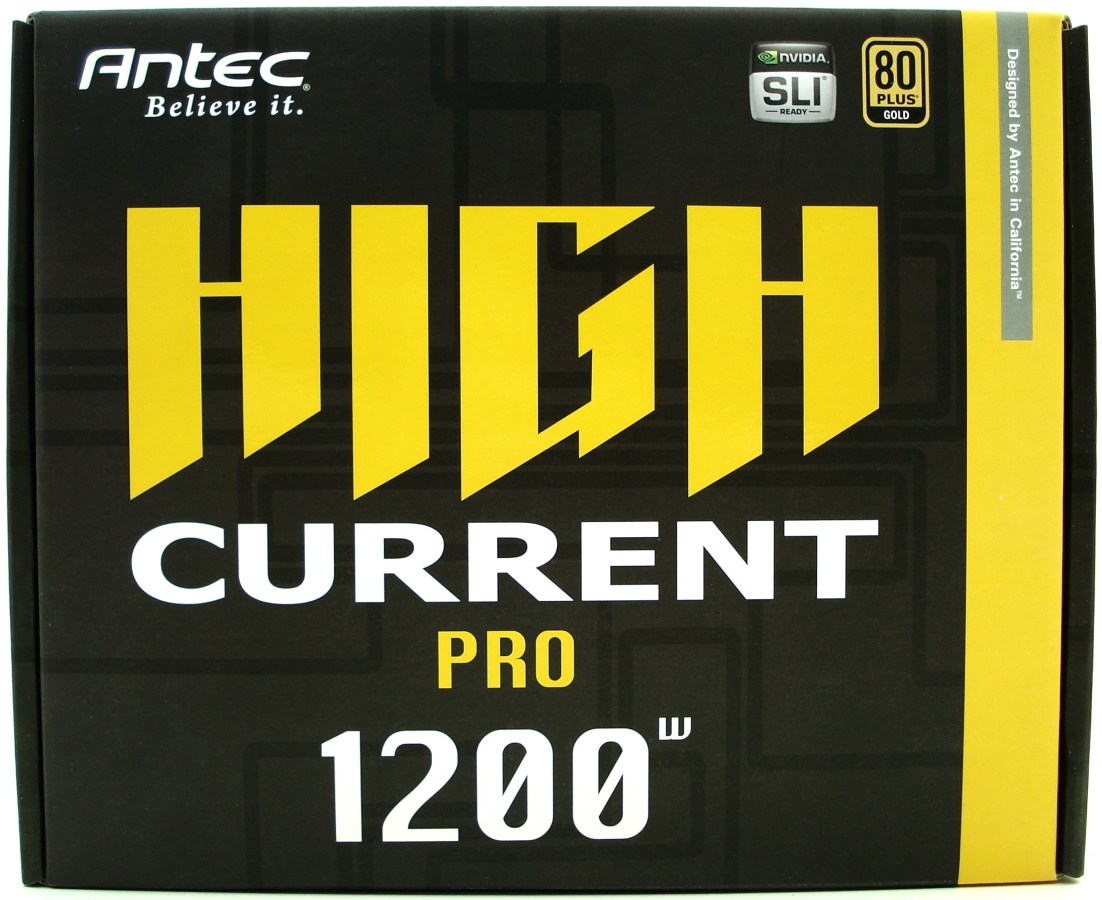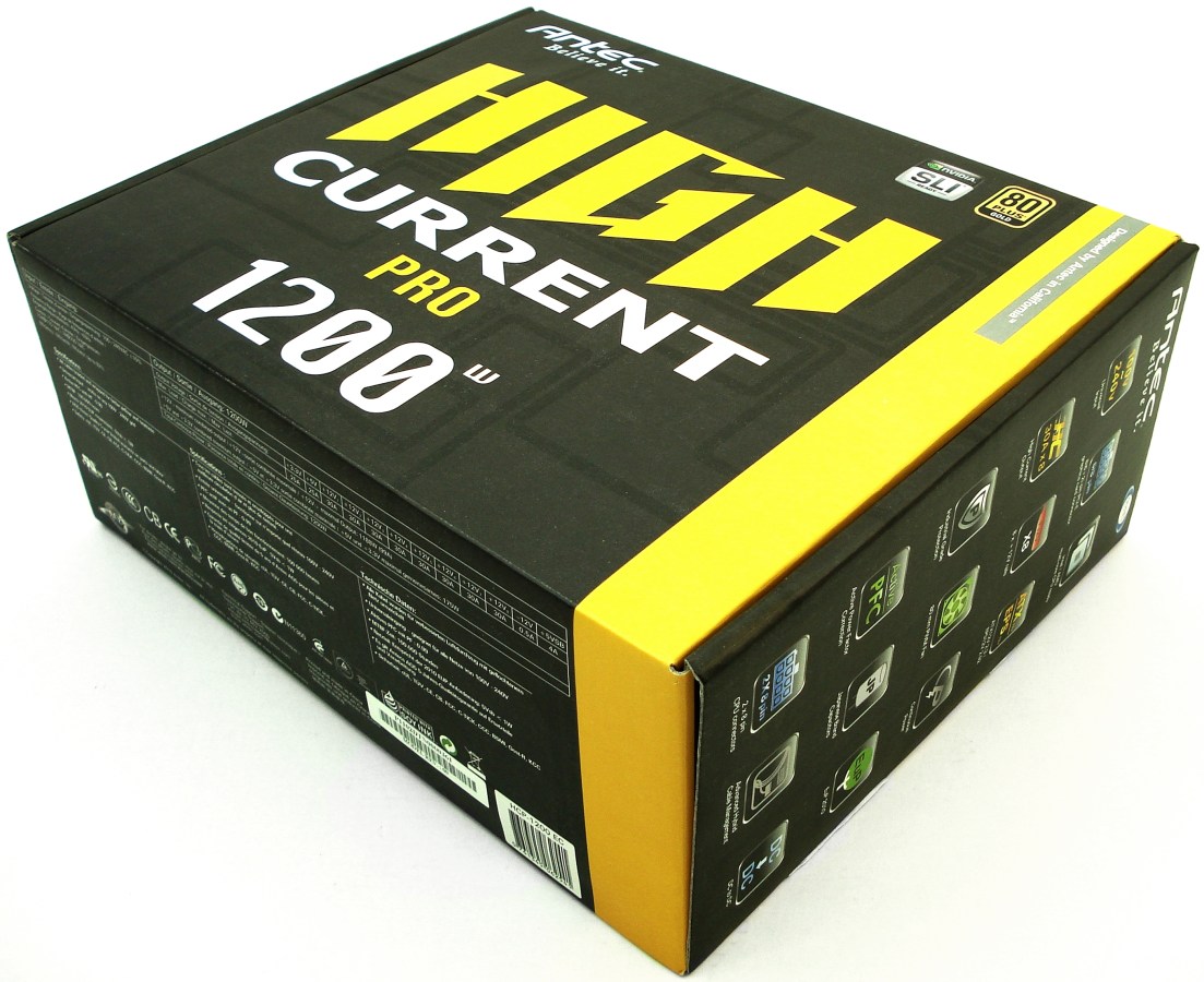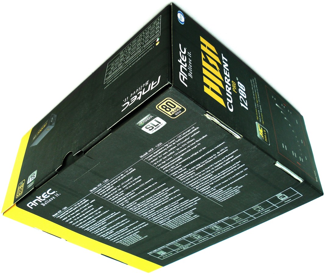 La cara superior nos muestra en amarillo y blanco la Serie a la que pertenece el producto «HIGH CURRENT PRO», justo debajo de la marca de ANTEC y las certificaciones SLI y 80 PLUS Gold. Tal como leemos en la franja amarilla, este producto se ha diseñado en California (Estados Unidos). Por último podemos leer la potencia de salida de la fuente, correspondiente a los 1200W.