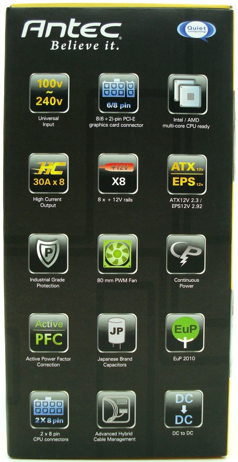 La caja de cartón es similar a la que se usa en la Serie HCG, es prácticamente negra con la típica línea amarilla a la que nos tiene acostumbrados ANTEC para presentar sus productos. Todas sus caras están muy bien aprovechadas para informar al comprador de todas las características y especificaciones del producto. Lo más destacable es el nombre de la serie y sus certificaciones de potencia para SLI y eficiencia energética 80 PLUS Gold. La característica más relevante es la cantidad de raíles de +12V funcionando a 30A, con un total de 8 raíles. Además, dispone de 2 tomas de 4+4 pines para alimentar placas base de elevado rendimiento, donde se necesita dos de estos conectores, como por ejemplo las placas base de doble socket, para procesador dual. Esta fuente de alimentación es ideal para uso intensivo en este tipo de entornos, muy apta para servidores, donde se necesita energía continua las 24 horas del día.