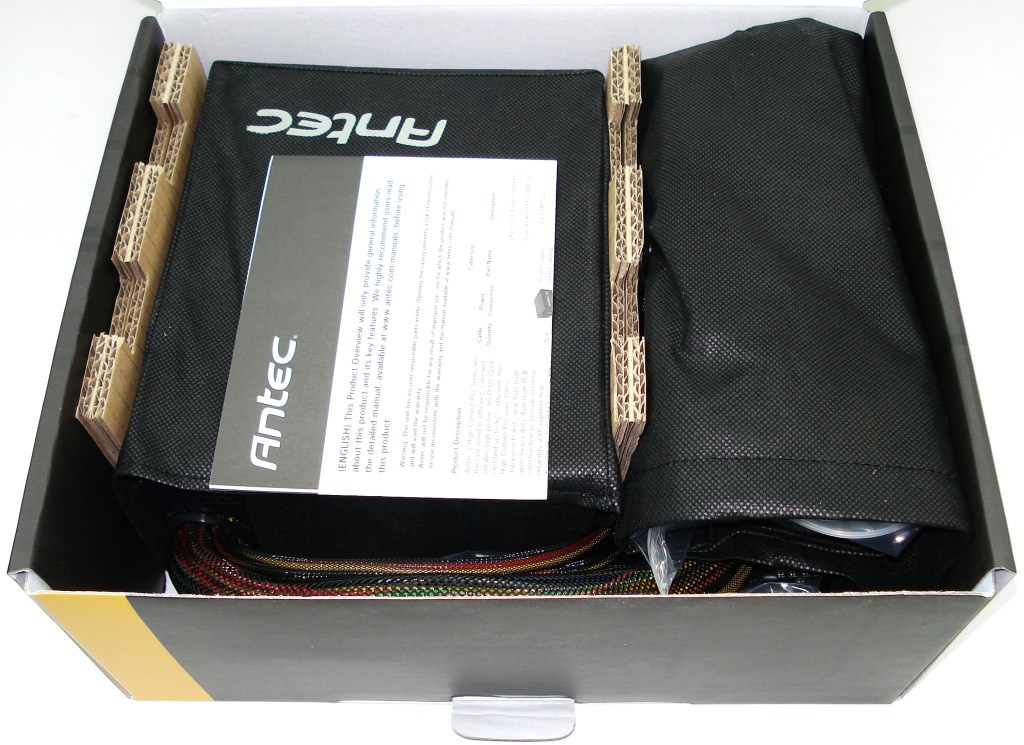 El fabricante ha presentado de forma bastante básica su producto en su interior. Lo más llamativo son sus protecciones, de doble capa de cartón rígido que amortiguará de forma justa los golpes al cuerpo de la fuente. Además viene protegida por una bolsa negra con cierre de velcro. La fuente de alimentación posee un cableado nativo, enfundado y atado con 2 cinturones de plástico ajustables y otro modular recogido en otra bolsa negra con hasta 7 cableados fácilmente identificables.