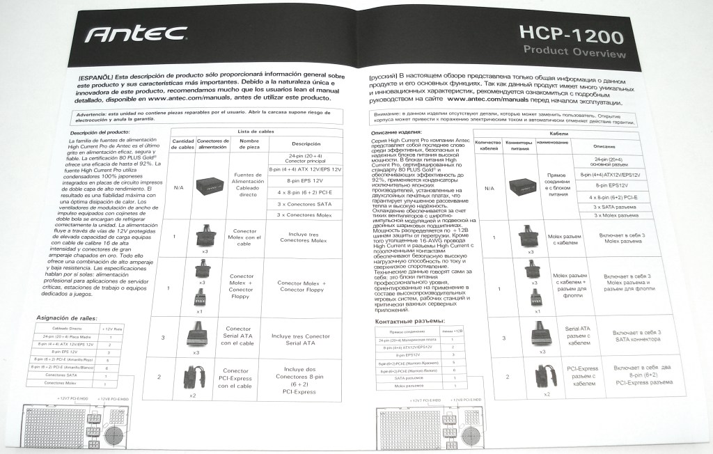 El práctico folleto plegado a 8 caras, se despliega en un DIN A3, traducido en hasta 8 idiomas por ambas caras, entre ellos el español, se delimita a describir de forma breve el producto y nos recomienda encarecidamente que leamos el manual de instrucciones antes de usar este producto. El manual de instrucciones está disponible en formato PDF en la web oficial de ANTEC, www.antec.com. Se puede consultar aquí: Manual de instrucciones HCG-1200.