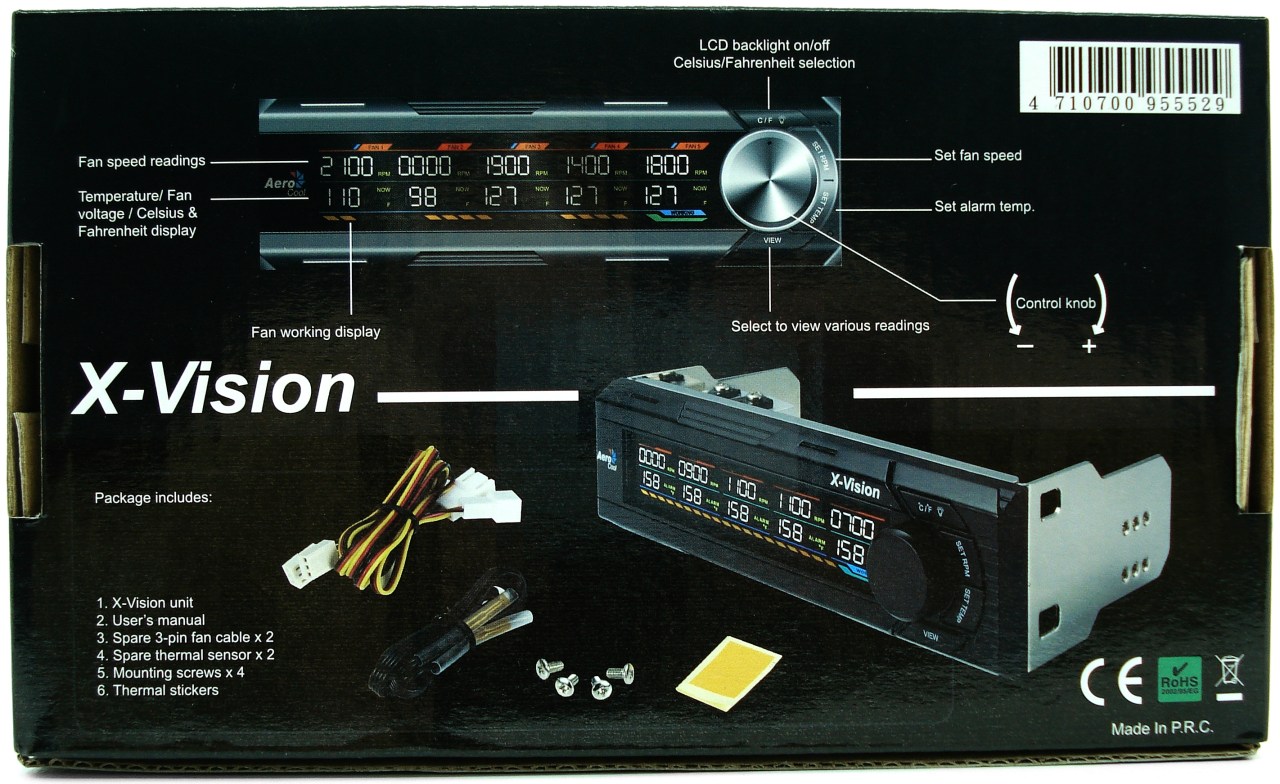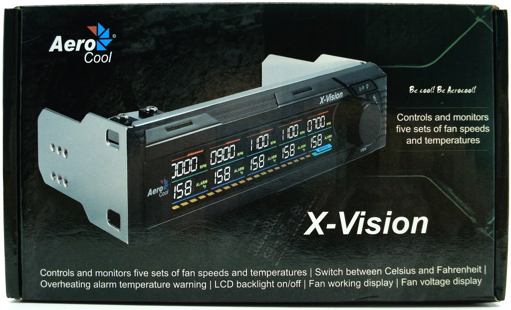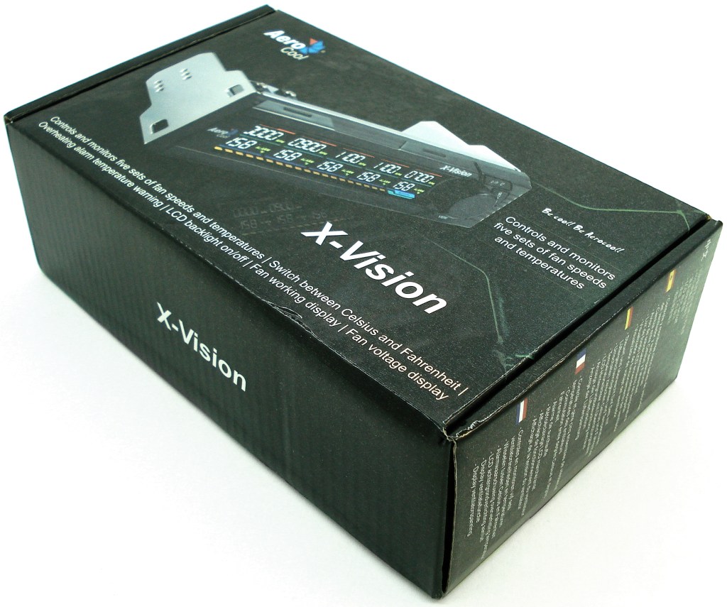 De entrada, Aerocool no se sale de su línea a la hora de presentar su producto. De hecho, si tuviésemos en frente cualquiera de sus productos sin estar la marca de por medio, sabríamos perfectamente que se trata de Aerocool. La caja para la X-Vision es una caja algo más grande que el volumen del panel, con doblajes en su interior para actuar de protectora. Totalmente negra por su exterior, se nos muestra prácticamente todas las funciones especiales de este panel, que no son pocas. Una de las cosas interesantes que veremos es que monitoriza también el voltaje de cada canal, algo no común en el resto de paneles del mercado, que se limitan a mostrar únicamente la velocidad de cada canal, algunos ni eso…