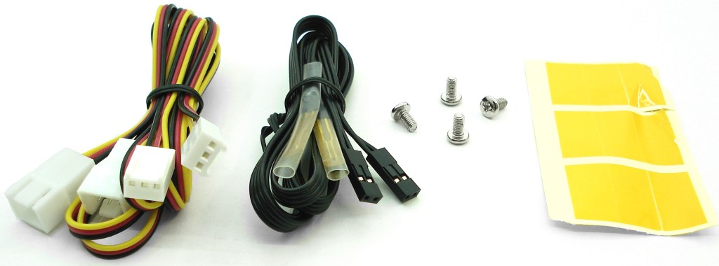 El kit de accesorios lo tenemos aquí al completo. Por un lado (de izquierda a derecha) tenemos los 2 alargadores con conectores en ambos extremos macho y hembra de 3 pines, solo compatibles con ventiladores con conectores de 3 pines, como es lógico. Recordamos que este tipo de cables poseen el cable amarillo que transmite la información de las RPM del ventilador. El cable rojo es el de +12V y el cable negro el neutro. Estos cableados sirven de repuesto a los 5 alargadores preinstalados. Además nos pueden servir para duplicar la distancia de conexión ventilador-panel empalmando 2 de estos alargadores en una sola tira. El resto de los 5 alargadores para los ventiladores vienen preinstalados y son extraíbles.