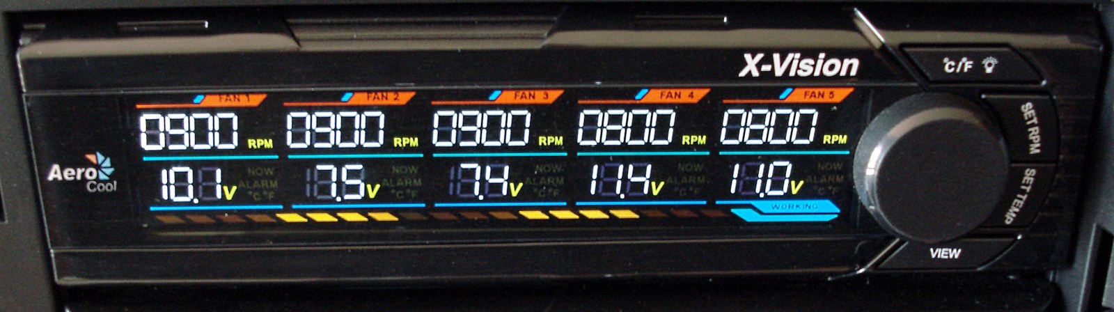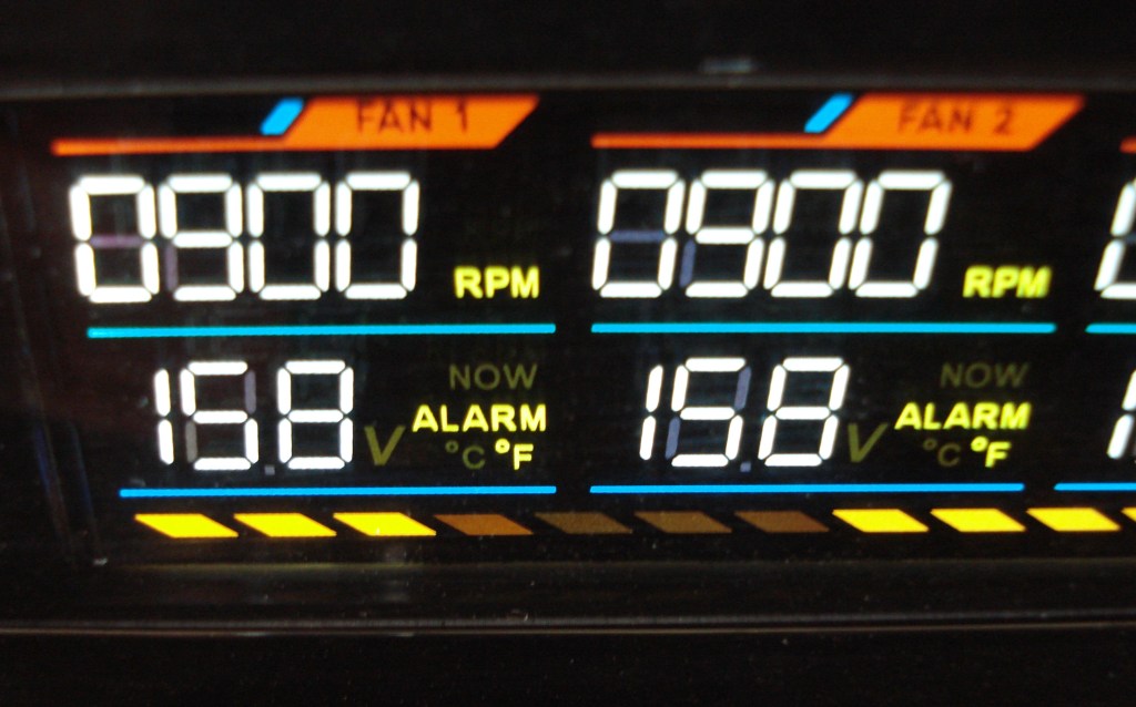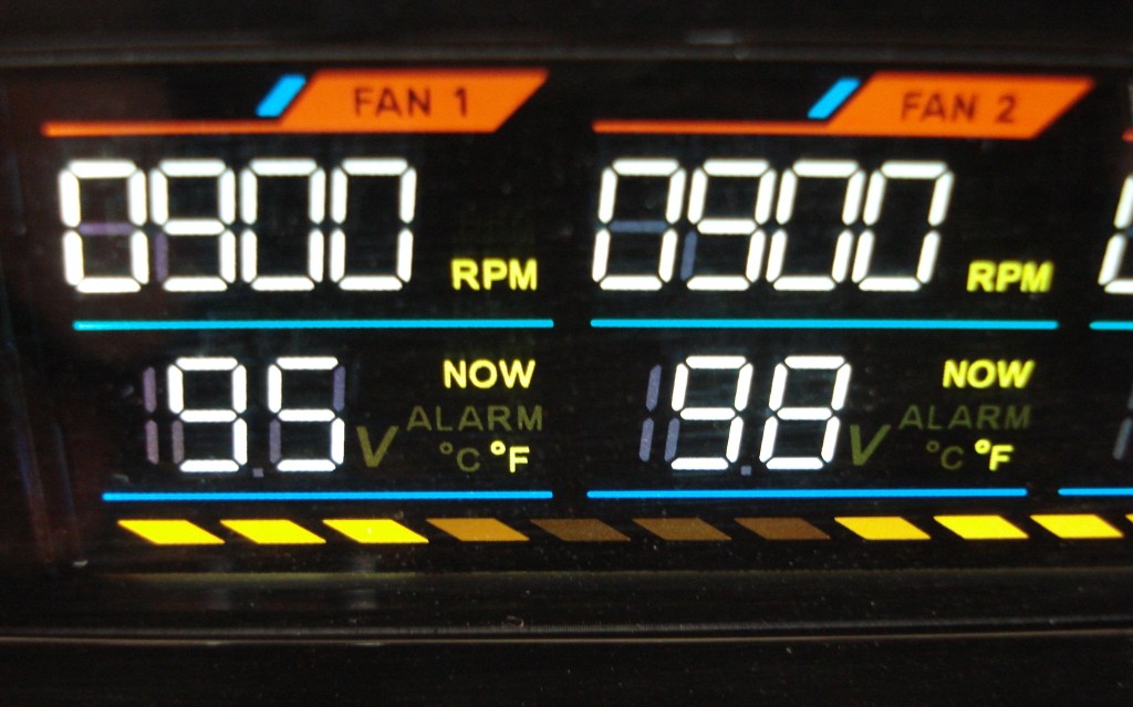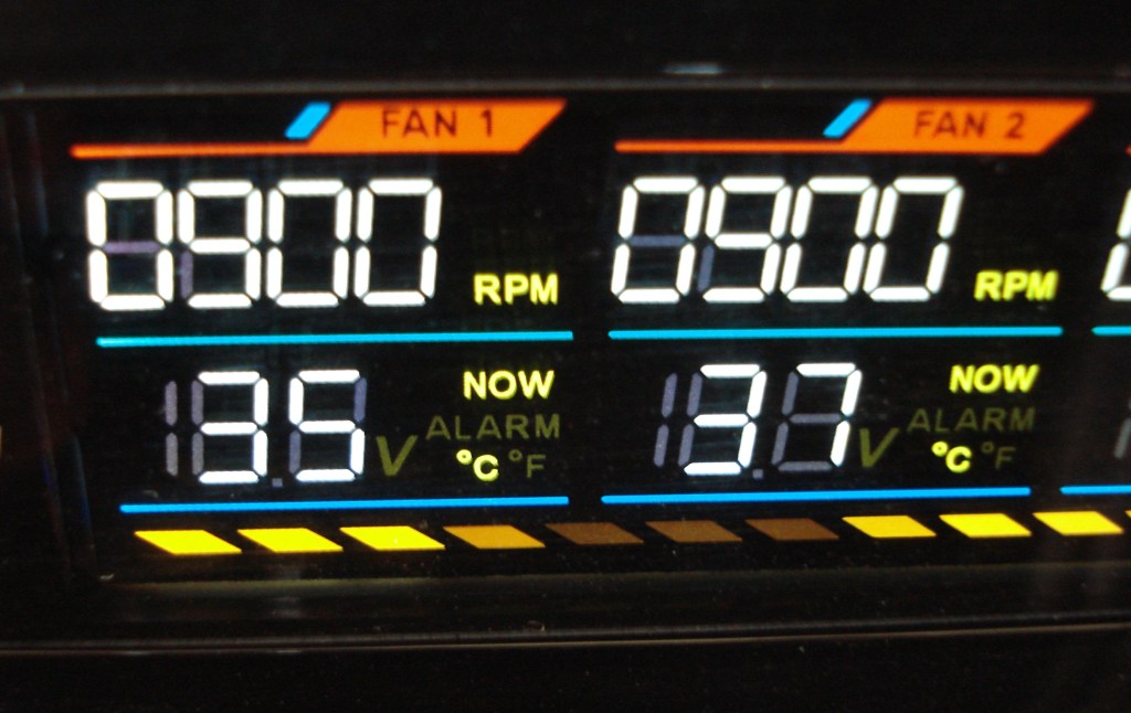 De entrada, lo que más nos ha sorprendido es la luminosidad de los caracteres de toda la pantalla LCD, con una limpia forma de cada uno de sus caracteres. Se combina el blanco, rojo, azul y naranja como colores protagonistas. En columna se detallan todos los canales, como FAN1, FAN2, FAN3, FAN4 y FAN5. Siempre tendremos monitorizadas las R.P.M. de cada canal, pudiendo cambiar el monitoreo de la línea horizontal inferior entre temperaturas y tensiones, con el botón View. La pantalla dispone de una área de visión considerable, muy ajustada con fácil leyenda de todos sus caracteres, gracias a su potente iluminación. Para apagarla se pulsa el botón superior más de 2 segundos.