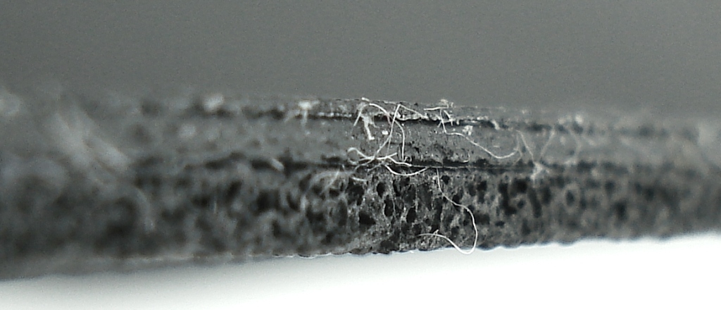 Si nos fijamos bien, toda la superficie inferior está fabricada con el mismo tratamiento superficial. Este material es el que mayor volumen ocupa del total de la alfombrilla. A continuación, veremos una sección de las capas, donde se puede identificar claramente los 3 niveles de capas y sus grosores reales.