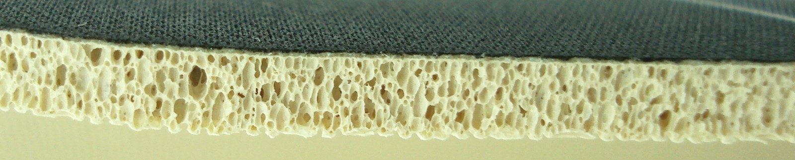 Esta es la textura interna seccionada de la alfombrilla, donde se pueden apreciar las 2 capas que la conforman. La más llamativa es su base, donde se ven los poros de aire, que aligeran la alfombrilla, aunque en este caso, su peso tiene relativa poca importancia. Gracias a esta composición, la base es flexible, y no semirígida, permitiendo ser aplastada con los dedos, con algo de presión. Podemos fijarnos en la perfecta adhesión entre ambas capas, superior e inferior.