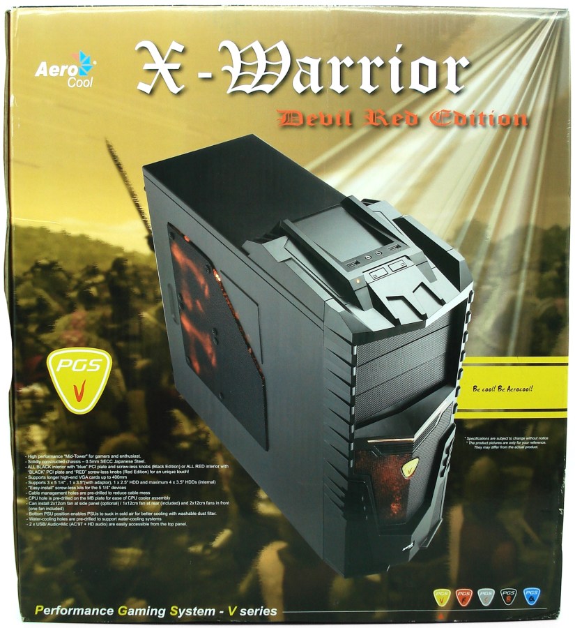Para empezar, las dos caras principales del embalaje son similares. Ambas poseen el nombre del modelo «X-Warrior» versión «Devil Red Edition» y la marca «Aerocool». También hace referencia a la Serie de cajas para gamers PGS-V, con el escudo amarillo. Ambas muestran como motivo principal una fotografía protagonista de la misma semitorre. En una cara se describen algunas de sus características, y en la otra se detalla el lateral izquierdo abierto y sin abrir, con una capacidad interna de 400mm para tarjetas gráficas. recordamos que la Serie PGS-V es una de las 5 disponibles de Aerocool para el entorno gamer, tal como nos muestra la primera fotografía.