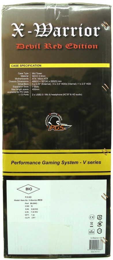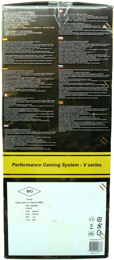 En esta cara se limita a listar las especificaciones técnicas de la caja, ya citadas anteriormente. Este modelo es el «X-Warrior Red», fabricado en la República Popular China. Posee el marcado CE, certificación RoHS, entre otros y como no, recordamos que este producto debe ser reciclado una vez finalizada su vida útil, que a más de uno se le olvidan estas cosas y acaban en el vertedero. Como podéis ver, dispone de los sellos de cumplimiento de la mayoría de productos de esta índole, y que ya tanto conocemos.
