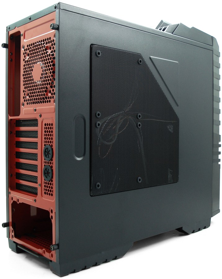 Dispone de un filtro antipolvo para la fuente de alimentación, éste extraíble. Pasatubos para RL en la parte Trasera, y un lateral derecho de rejilla metálica microperforada preparada para montar 2 ventiladores de 12cm, con sus 8 perforaciones pasantes para los tornillos. A parte de las patas y su panel superior de conexiones, poco más podemos añadir.