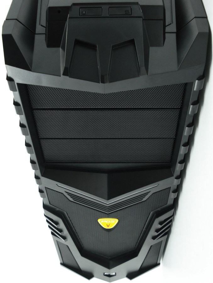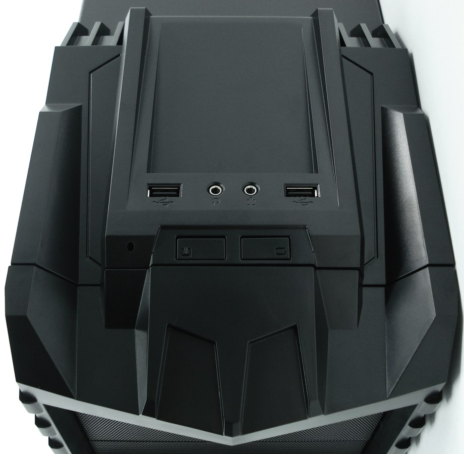 El frontal posee dos detalles a tener presentes. El primero es su diseño agresivo, y el segundo la cantidad de rejillas metálicas microperforadas que posee. Las 3 placas para tapar las bahías superiores lo son, al igual que las 3 superficies inferiores con formas geométricas llamativas. En la parte central dispone una tira en «V» que se ilumina en rojo una vez encendemos la X-Warrior (LED de encendido), dándole un toque modding, junto a los LEDs rojos del ventilador frontal. El pequeño LED de actividad de las unidades de almacenamiento se sitúa en la corona, al lado izquierdo de los botones, enfocado hacia delante.