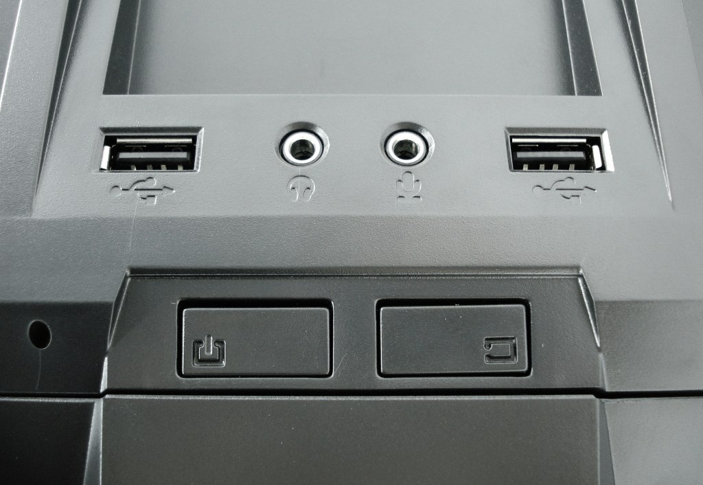 El panel superior de conexiones dispone de simetría centrada. En el exterior disponemos de 2 puertos USB 2.0 (no dispone de ningún puerto USB 3.0) Además más al centro y equidistantes entre los puertos USB se sitúan los conectores de tipo jack de 3.5mm para auriculares y micrófono.