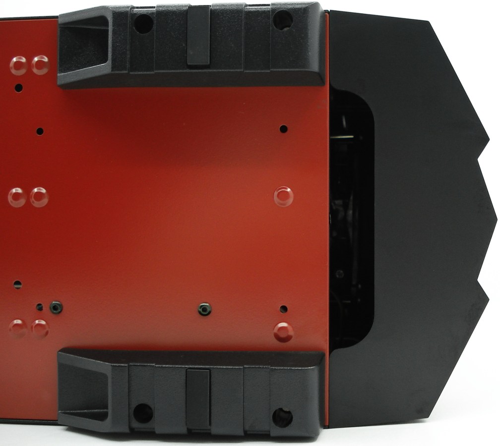 La parte inferior se eleva gracias a sus 4 grandes y largas patas de plástico ABS. Éstas están fijadas con 2 torillos sobre el chasis metálico. Además, cada una de ellas dispone de una tira de goma adherida a ellas para asentar sobre la superficie de plana de apoyo. Las 2 patas traseras a la vez hacen de guía o eje para la fijación del filtro antipolvo, estraíble por la parte de atrás. En general, las patas tienen bastante resistencia y asientan bien, con sus gomas impiden deslizamientos bruscos, aumentando el rozamiento con cada apoyo.