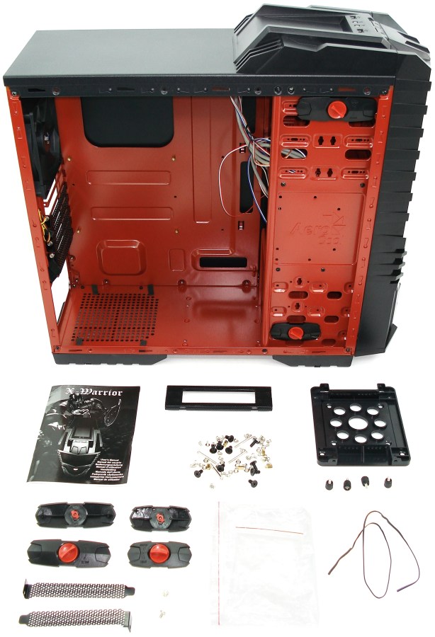 La X-Warrior posee un muy buen acabado en pintura, en negro y rojo, tanto en el exterior como en el interior, completamente pintada. Además, el tratamiento de ensamble y doblado del laminado de acero tipo SECC es francamente bueno, con doblajes para evitar cortes ayudando a rigidizar toda la caja, obteniendo como resultado una semitorre de poco peso y a la vez robusta. Su kit de accesorios es bastante acertado, al igual que los 2 ventiladores de 12cm adjuntos, el frontal con LEDs rojos para darle más modding al conjunto; ventiladores con bastante caudal a una sonoridad media salvable. Así de fábrica ya viene con 2 ventiladores de entrada y salida de aire que garanticen un ciclo interno de caudal.