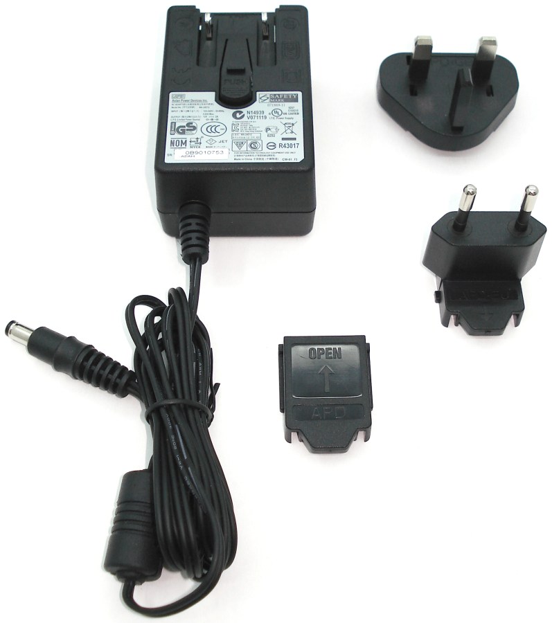 Para alimentación de la unidad grabadora, se emplea un transformador adjunto con 2 adaptadores de enchufe para cubrir todo el territorio europeo (incluyendo Reino Unido, que recordamos que usa un enchufe de conexión específico). Para conservar al máximo los bornes de conexión de los adaptadores, tenemos una tapa de acople de protección.