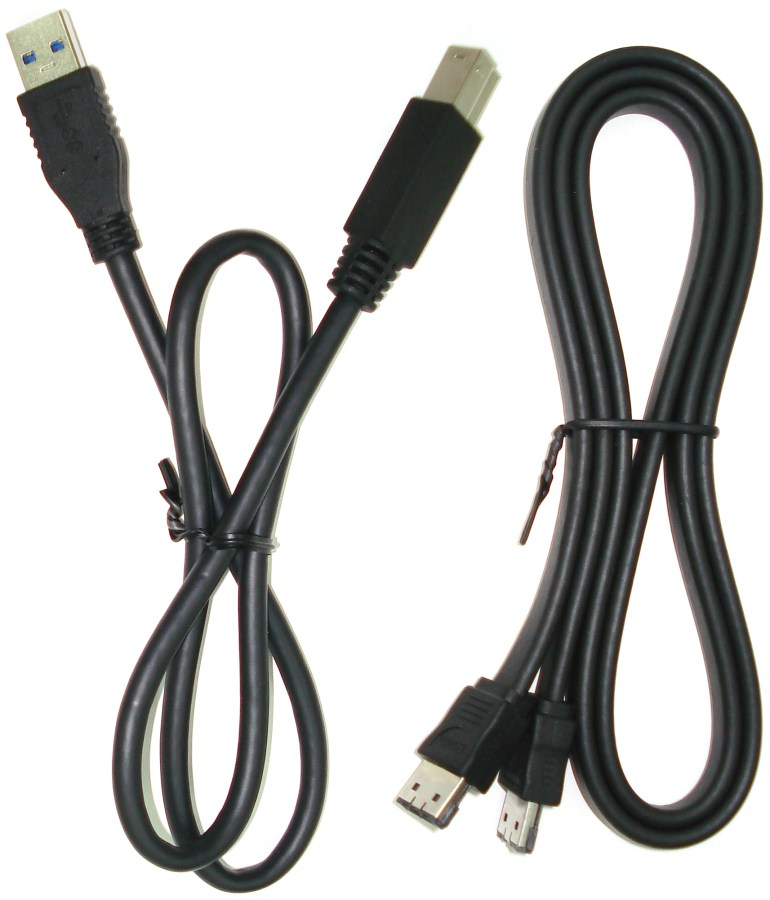 Para la transferencia de datos podemos usar 2 interfaces, a través de los cables que adjunta. Por un lado tenemos el cable USB compatible con 3.0 y 2.0. La interfaz 3.0 es la más veloz actualmente para conectar dispositivos externos, por encima del eSATA. Este cable es demasiado corto, con una longitud que nos obliga a tener la unidad grabadora muy cerca del PC. Además, podemos usar la interfaz eSATA, esta vez con una cable con una longitud más acertada. No obstante, con una u otra interfaz, la grabadora funcionará igual de correcta.