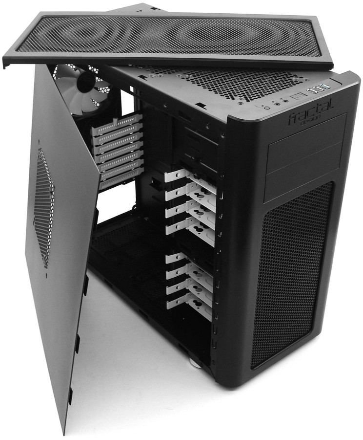 De todas formas, no todo es bienvenido por todos, y sabemos que a más de un usuario se le irán los ojos hacia la zona frontal donde se encuentran las 2 bahías de 5.25″, afirmando que no tienen suficiente. Fractal Design ha diseñado una semitorre muy robusta y ello conlleva generalmente un elevado peso. Sus 10 kg de peso neto igual son demasiados para este tipo de torres, pero desde nuestro punto de vista son todo un acierto; nosotros no le quitaríamos ni un gramo, ya que de paso ayuda a estabilizar y a contrarrestar las vibraciones internas.