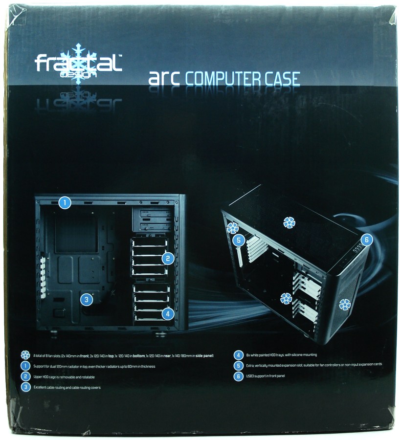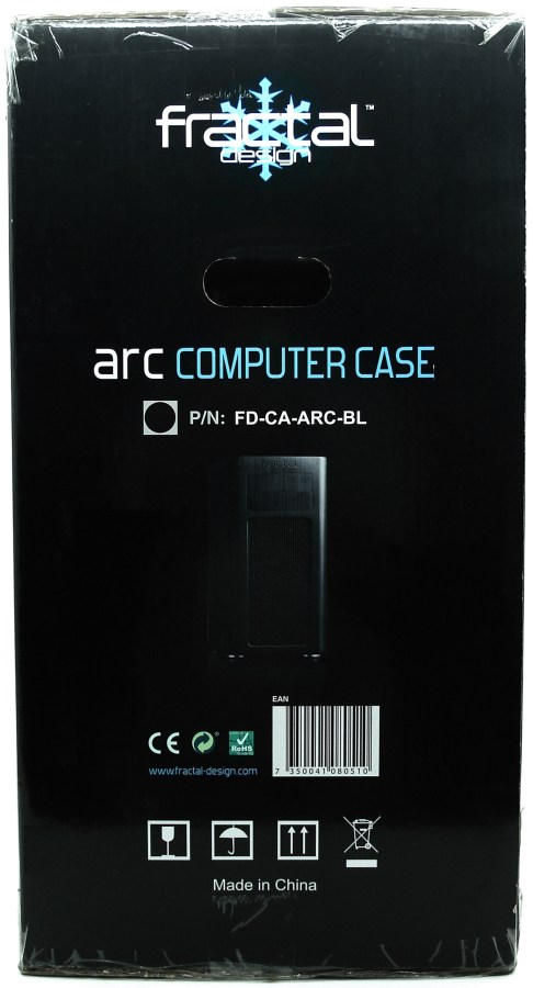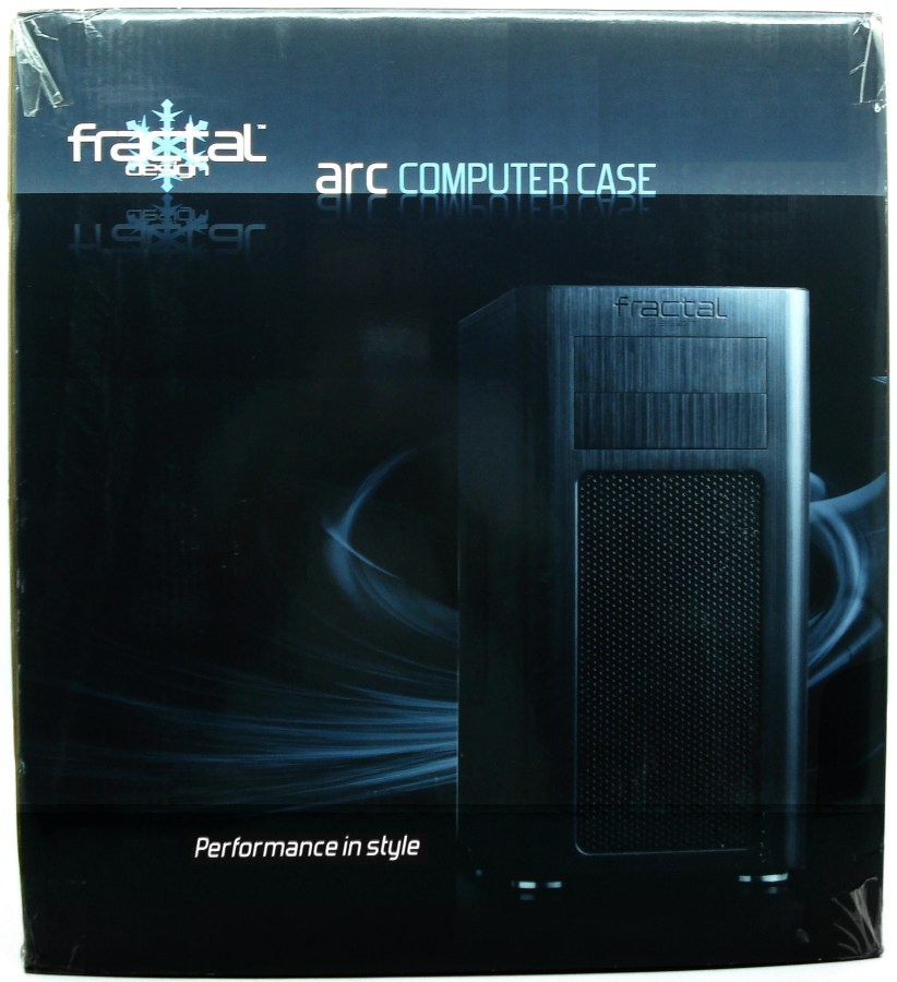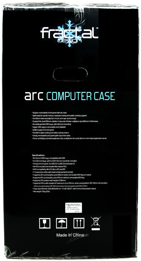 De entrada, en la cara frontal del embalaje se ha diseñado un motivo muy sobrio, sin colores llamativos, haciendo resaltar el diseño de la Arc Midi por encima de todo. Encontramos el llamativo logotipo de la marca Fractal Design, así como la serie al a que pertenece, Serie Arc. El resto es el motivo de una fotografía casi frontal de la propia semitorre con fondo oscuro, acompañado de la frase «Rendimiento con estilo». Tal como veremos a lo largo del análisis, su capacidad de refrigeración activa, de fábrica y junto con la opcional, son una de sus mejores características, viniendo de una semitorre con estas dimensiones.