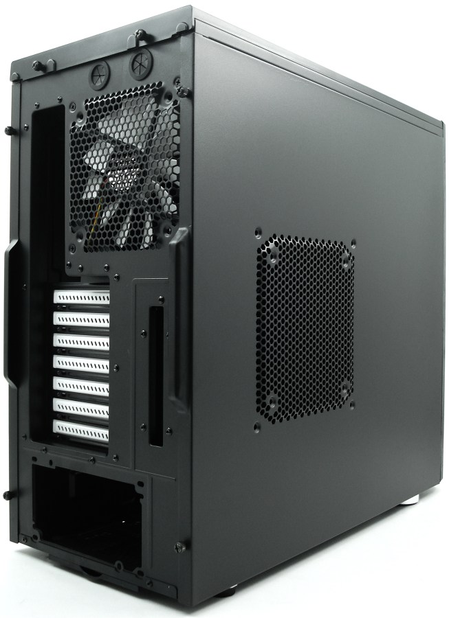 La parte frontal y la del lomo tienen un aspecto muy similar. La parte frontal soporta 8 bahías internas de 3.5″, con raíles extraíbles y atornillables; las veremos más adelante. En la parte superior del frontal se prensa el nombre de la marca «Fractal design», ocupando bastante espacio. Quizá si se emplearan tan solo 7 bahías internas de 3.5″, daría cabida a 3 bahías externas de 5.25″. Así el conjunto estaría más equilibrado. Nos cuesta imaginar un PC con 8 discos duros montados en su interior. En cambio, es muy probable terminar usando hasta 3 bahías externas. Con un multilector de tarjetas, un panel controlador de revoluciones, una lectora/grabadora, o un rack de audio, entre otros, son componentes que seguimos demandando. Solo por estos detalles hay usuarios que descartarían la Arc Midi de sus posibles candidatas de compra.