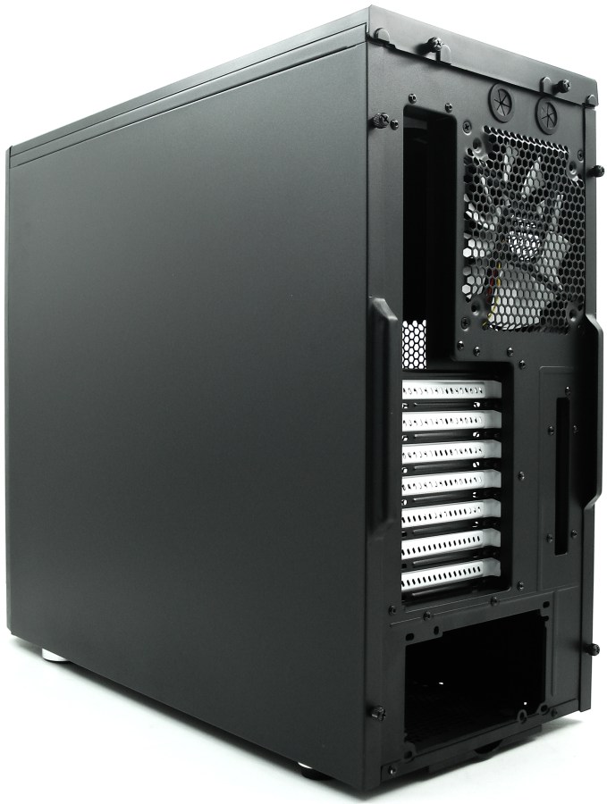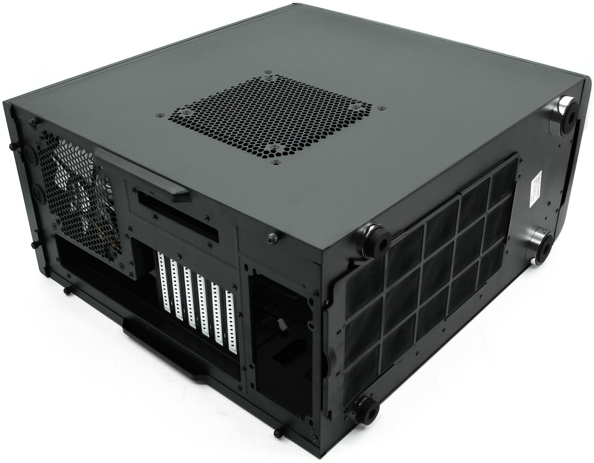 La parte trasera se ha aprovechado al máximo, incluida la zona vertical de todo el recorrido en altura de las placas traseras PCI. La parte superior tiene 2 pasatubos para RL o también para pasar cables. Para la fuente se ha preparado un marco para antivibración. Por último tiene capacidad para un ventilador de 12/14cm. Qué lástima que el lateral izquierdo no se haya trabajado más.