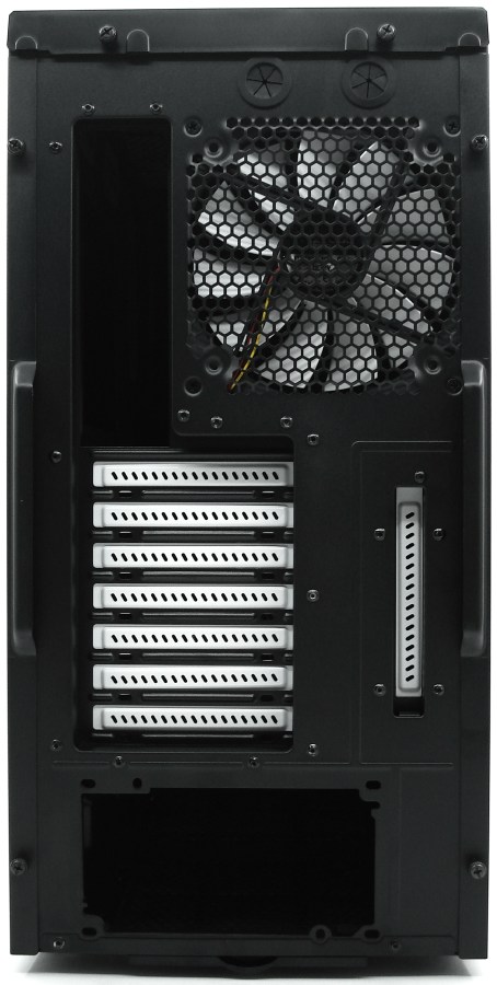 La parte trasera está ejecutada prácticamente a la perfección. Tan solo tiene un pequeño inconveniente, si se emplea la placa vertical situada en frente del resto de placas PCI, ya que sería imposible acceder a los tornillos de éstos si no se desmonta antes. Por lo demás, está muy bien estudiada.