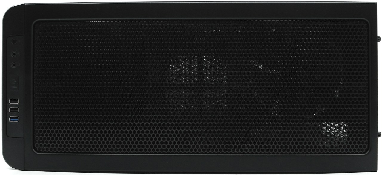 El lomo de la Arc Midi es otra de las caras muy bien estudiadas para aprovechar al máximo el espacio que dispone. 3 Ventiladores es capaz de albergar (3 de 12cm, o 3 de 14cm o 1 de 18cm; ahí es nada), con un lomo que tapa con personalidad esta parte con su filtro antipolvo, que cubre totalmente dicho lomo, con una placa perforada hexagonalmente idéntica al frontal y fácilmente extraíble por la parte de atrás, quitando 2 tornillos de fijación, al igual que los laterales. El hecho de colocar el panel superior de conexiones encima del frontal hace posible esta configuración, aprovechando al máximo la profundidad total que dispone.