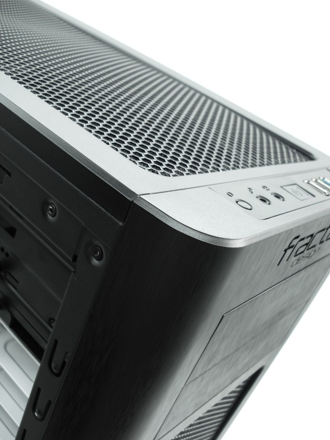 Esta otra está tomada para demostrar la «delicatessen» en el acabado y encuentro entre diferentes cuerpos de materiales, con curvas y rectas que encajan perfectamente. Este tipo de detalles demuestran la capacidad de Fractal Design para defenderse como fabricante, a pesar de emplear los materiales más baratos posibles (como hacen prácticamente todas las marcas), se intenta conseguir la mayor calidad posible, explotando cada material, lo que éste les permite.