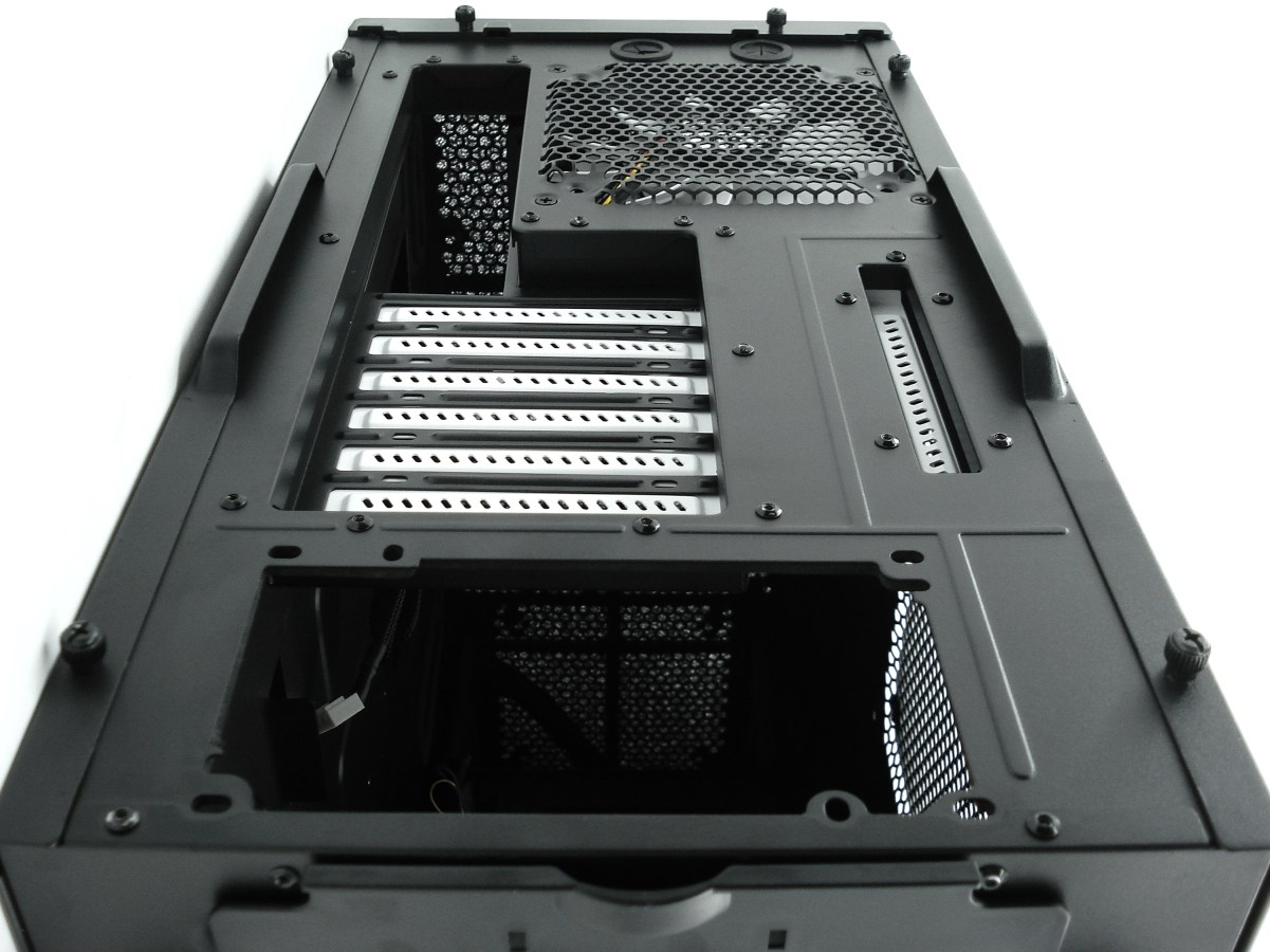 En la parte trasera poco más podemos añadir. Está llena de remaches de ensamble, rejilla metálica hexagonal para el ventilador instalado, placas PCI pintadas en blanco con perforaciones alargadas (en su interior también veremos otros componentes pintados en blanco). Si no fuera por el lateral izquierdo, sería una de las cajas mejor cubiertas contra el polvo del mercado, incluyendo la parte trasera. Es de agradecer que los 6 tornillos accesibles se puedan extraer manualmente.