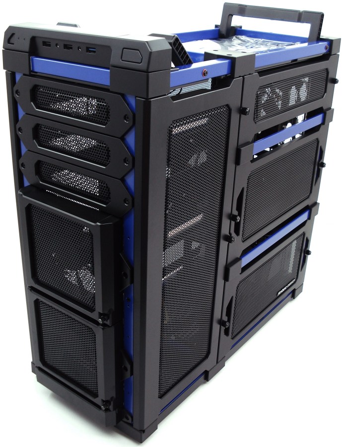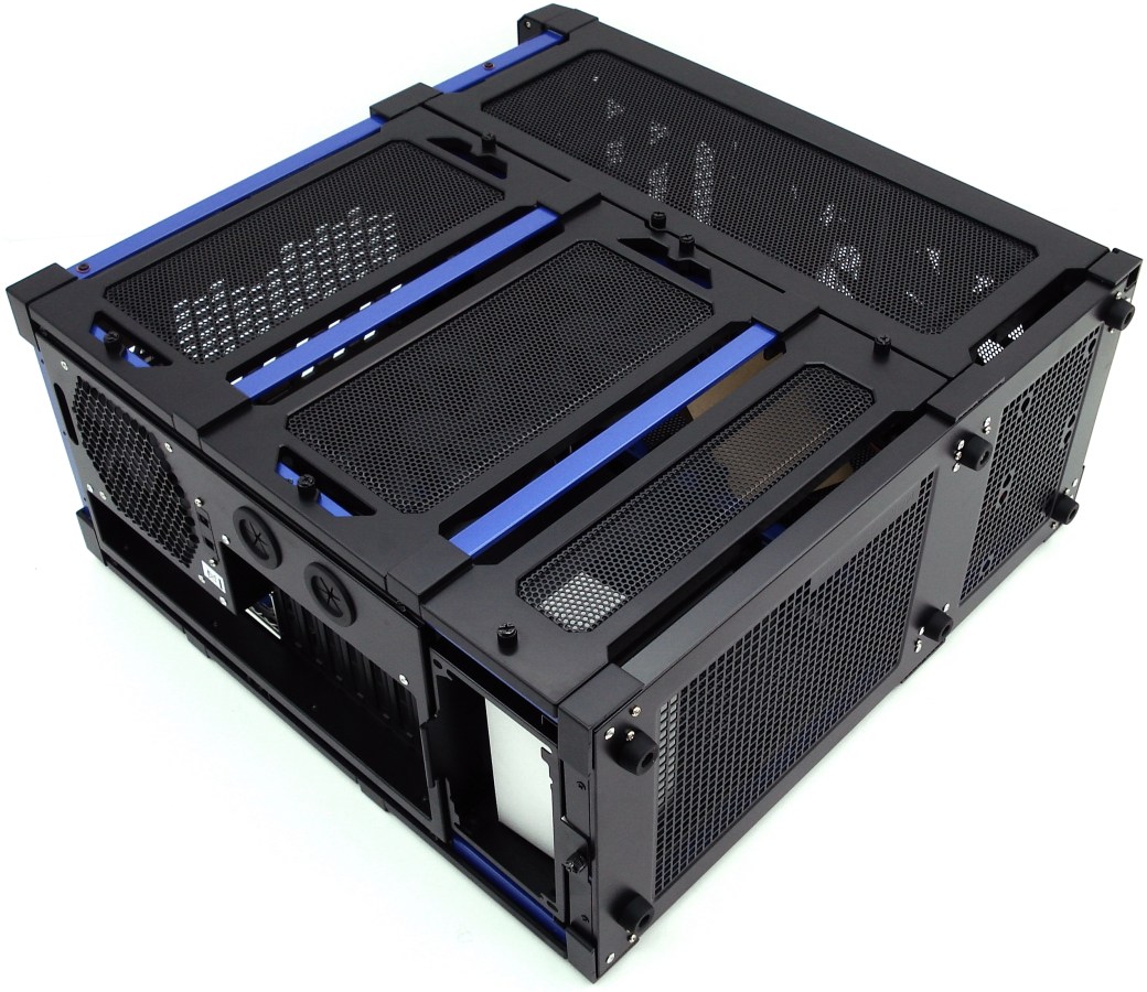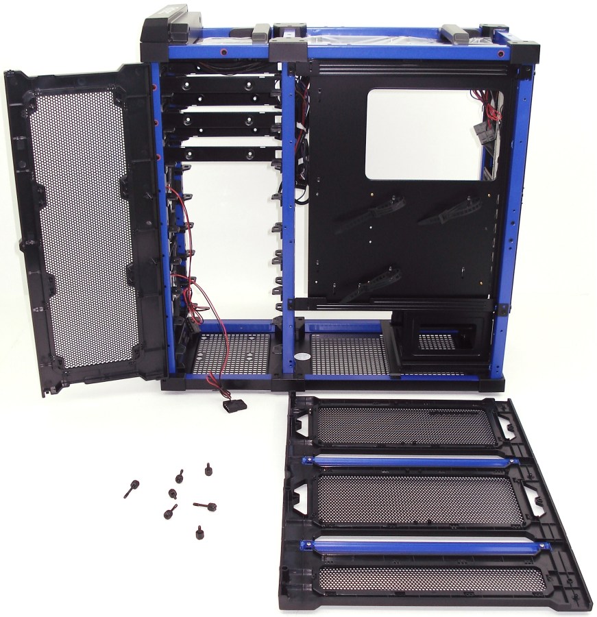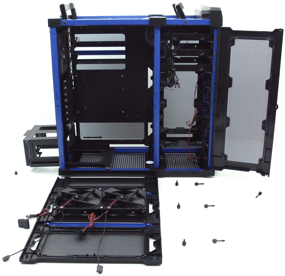 El diseño de Antec consigue exprimir casi al máximo todo el espacio volumétrico dentro de este esquema esquelético, a través de 6 montantes verticales y varios travesaños que conforman junto con el lomo y la base, una estructura robusta que será cerrada por multitud de tapas, todas ellas desmontables. Las únicas partes no desmontables son su base y el lomo. El resto puede ser desmontado, o bien para acceder al interior, o para permutar dispositivos. El hecho de poder montar la fuente de alimentación arriba o a bajo permutando con la placa base, es una gran ventaja. Gracias al diseño interior más adelantado, podremos colocar hasta 3 tarjeta gráficas de más de 400 mm de longitud, invadiendo la zona destinada para los dispositivos de almacenamiento de datos.