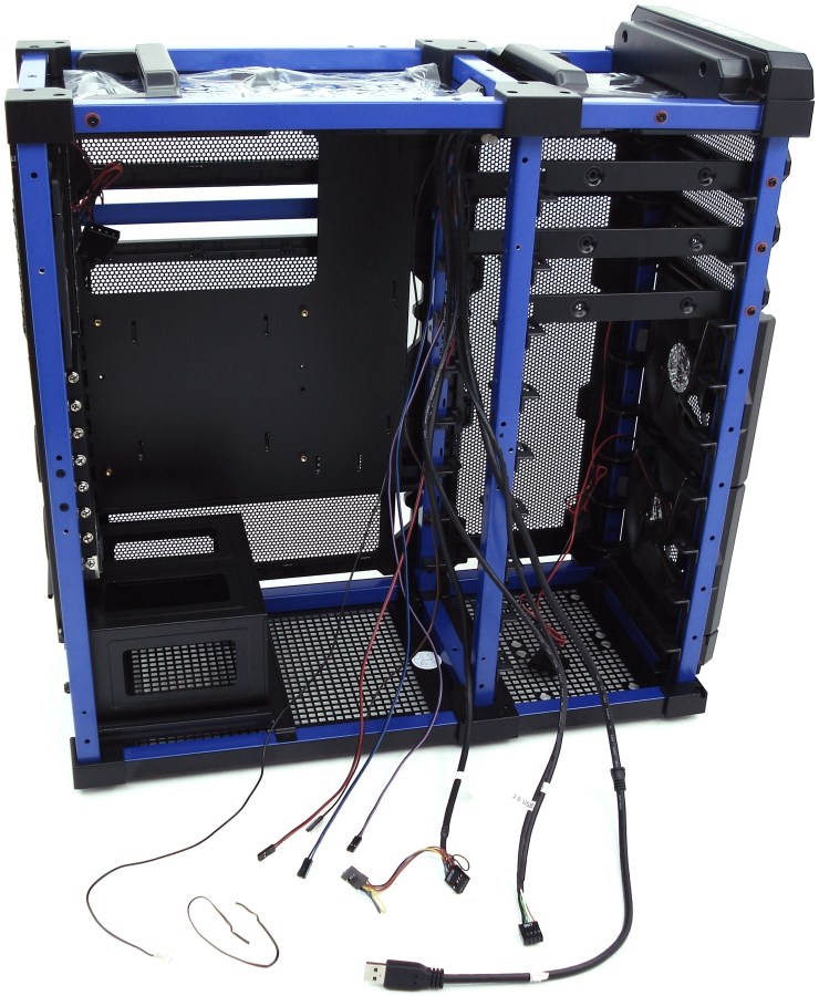 La refrigeración activa es superior a la media, pero no es la panacea. Los ventiladores son duraderos, pero no muy silenciosos a pleno gas, aunque su caudal es poderoso. Gracias a los 2 potenciómetros delanteros y los 3 interruptores de doble posición de cada ventilador lateral y trasero, podremos controlar la relación rendimiento/sonoridad de los mismos. El hecho de ser totalmente abierta sirve para evacuar el aire caliente, y a la vez para evitar que se acumule el polvo. No obstante, habrá que mimar un poco la fuente de alimentación, porque ésta tal vez trague demasiado a la larga. Además, es capaz de soportar hasta 15 ventiladores de 12 cm, una cifra muy elevada.