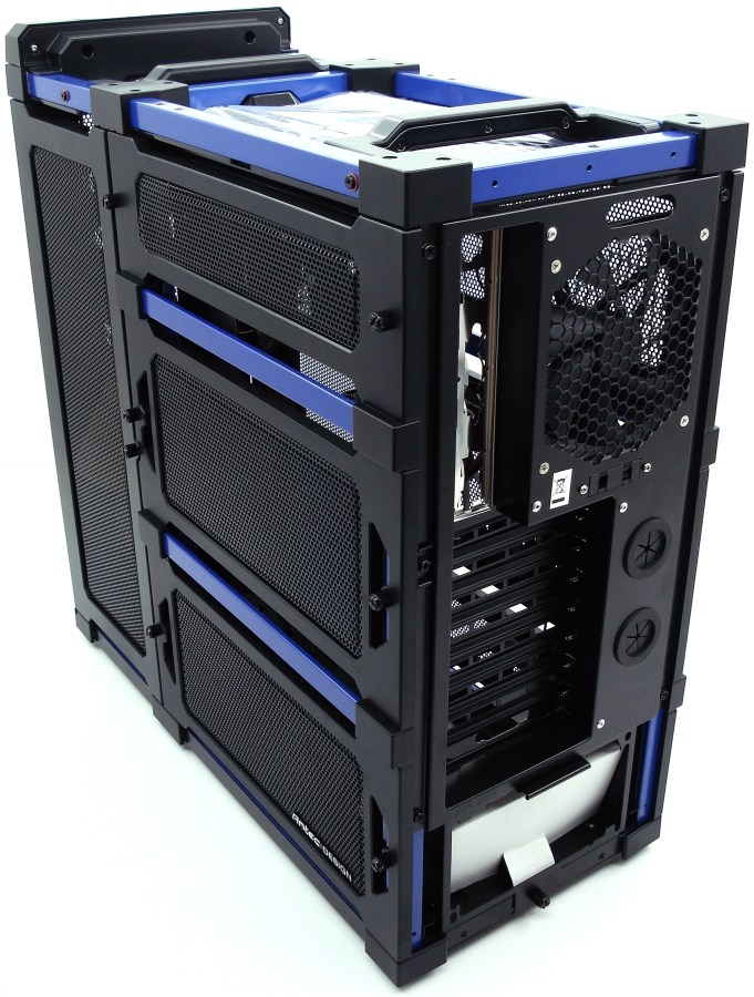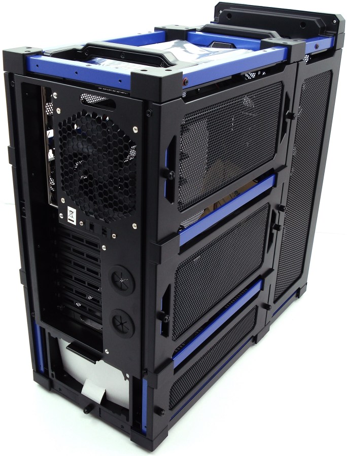 En segundo lugar, tenemos el diseño completamente esquelético de todo el chasis metálico. Esto posibilita el desmontar la placa metálica trasera donde se ubica la placa base para poderse regular en altura, así podremos colocar la fuente de alimentación en la parte inferior o en la parte superior de ésta, a través de un compartimento también totalmente extraible y reubicable en 2 posiciones, inferior y superior. Tal y como viene presentada la LanBoy de fábrica, la fuente se sitúa en la parte inferior y la placa base en la superior.