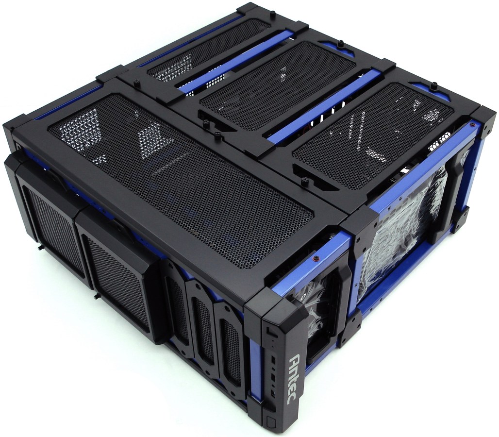 Tal como podemos ver, el resto de características pueden ser comunes a la mayoría de semitorres de calidad de la actualidad, con un toque personalizado y ya acostumbrado por parte de Antec con algunos de sus extras, además de: un amplio espacio interno, gestión del cableado trasero estudiado, 6 patas de goma de calidad para buen asiento y una refrigeración activa opcional francamente superior a la competencia, con la posibilidad de instalar hasta 15 ventiladores de 12 x 12 x 2.5 (cm), ahí es nada. Además, no se queda corto a la hora de aprovechar al máximo la unión interna delantera con la trasera gracias al diseño del espacio delantero, que da la posibilidad de ser invadido sin obstáculos por hasta 3 tarjetas gráficas de más de 40 cm de longitud, evidentemente sin la instalación de dispositivos delanteros en la misma altura que éstas.