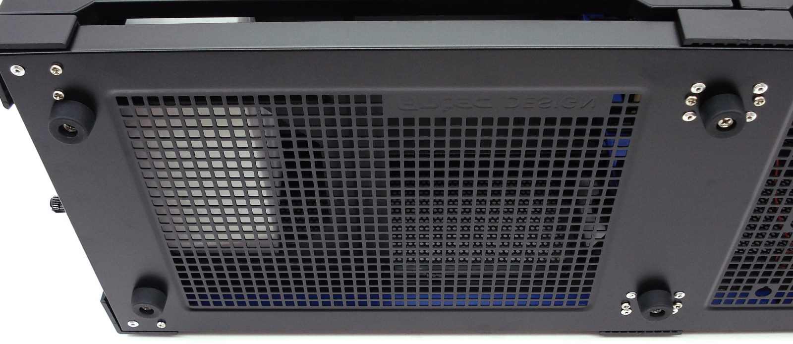 La base sigue la misma división que el lomo, entre 2, una delantera y otra trasera. La zona trasera está completamente abierta con perforaciones cuadradas, que dejan pasar el polvo y evitan que se acumule por decantación. Además, permitirán que la fuente de alimentación se ventile por dicha zona. El problema es que la fuente de alimentación no se va a salvar del polvo. Quizá un filtro antipolvo exclusivo para ella no hubiera sido mala idea. No se podrá instalar ningún ventilador adicional en la zona intermedia.