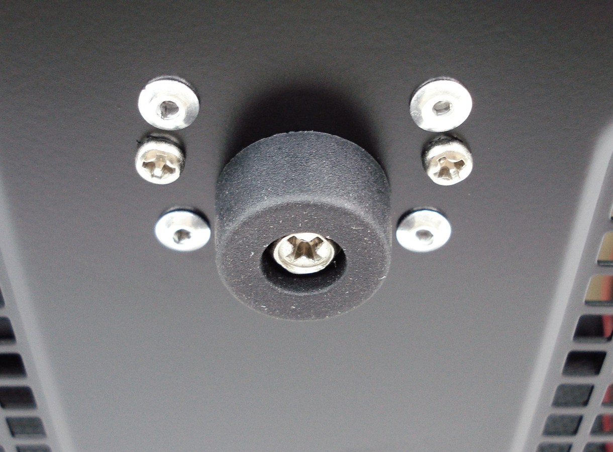 Cada una de las 6 patas es de goma, y atornillada firmemente por un tornillo en su centro, por el tronco. No hemos probado a desmontar alguna, así que desconocemos si también viene adherida al metal, método de unión muy empleado en este tipo de cajas. El hecho de emplear 6 patas, cada una debajo de cada montante, ayudan a transmitir los esfuerzos sobre la base de apoyo con mejor reparto. De este modo se garantiza mayor robustez en la zona intermedia, ya que se apoya también sobre esta zona, gracias a las patas intermedias.