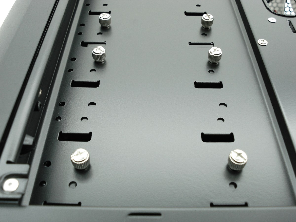 Al igual que en la parte accesible por la izquierda, cada compartimento está atornillado por 4 tornillos de cabeza gruesa manual por cada lateral. Así que extraer los 2 compartimentos implica desatornillar 16 tornillos. Actualmente hay sistemas de raíles con los que con un solo tornillo extraído, nos podemos hacer con el compartimento. De todos modos, este sistema es muy robusto y casi es preferible así, ya que este tipo de operaciones se hacen en muy pocas ocasiones.
