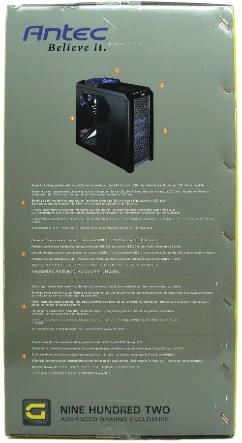 Podemos ver el logo de la marca «ANTEC» y el nombre del modelo «NINE HUNDRED TWO», con un subtítulo que hace referencia directa al mundo gamer «ADVANCED GAMING ENCLUSE», «The Ultimate Gaming Case, Evolved». Como siempre la franja amarilla lateral muestra su presencia resaltando su diseño por Antec en California.