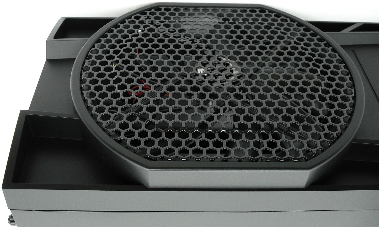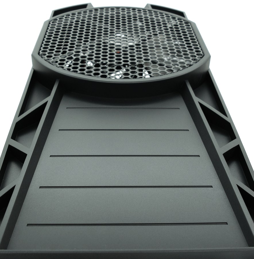 La parte más retranqueada del lomo posee la rejilla protectora que sobresale en altura de la superficie plana de la bandeja. Esta rejilla con perforaciones exagonales, envuelte la silueta del ventilador TriCool Big Boy de 20cm de Antec. Este ventilador, al igual que el trasero, son de extracción de aire, y podrán ser regulados a través del panel controlador trasero de RPM.