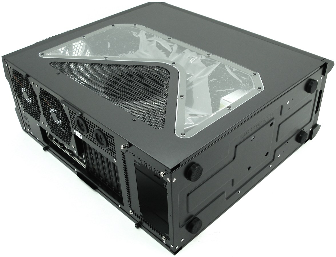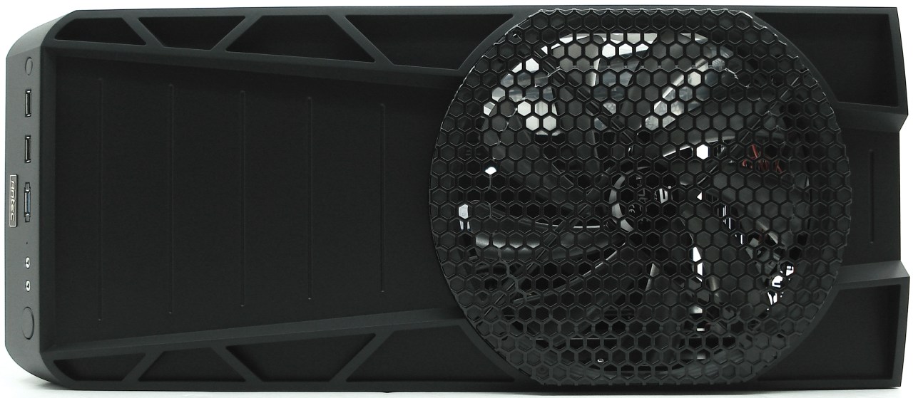 La parte superior conserva su simetría, con una bandeja delantera y una enorme rejilla para protegernos del ventilador de extracción de aire, el Antec Big Boy de 20cm con LEDs azules. El lomo en general, está bastante bien aprovechado, pero resultará algo difícil limpiar dicho ventilador si no lo desmontamos desde su interior, una vez acumule mucho polvo. Algo más de funcionalidad en el lomo se podría resolver para poder acceder más fácilmente a este gran ventilador pero ya implicaría cambios más radicales en el diseño superior. Una mejora podría ser la extracción manual de la mitad trasera de dicho lomo, separándola de la bandeja.