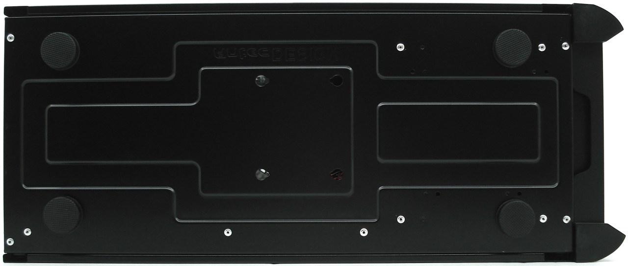 La parte inferior conserva toda la lámina tapada de acero. Las patas cobran un protagonismo sustancial en la Twelve Hundred V3, ya que asientan como nadie la torre a la superficie base, siendo una característica muy señalable. No obstante, la zona trasera no viene micro perforada ni con filtro antipolvo, por tanto no podremos colocar el ventilador de la fuente de alimentación para que recoja aire frío de la zona más baja exterior de la torre. Posee 4 perforaciones más adelantadas para poder instalar una unidad SSD. Por otro lado, las 2 patas frontales acabadas en punta no asientan sobre la base, se quedan cortas en altura unos 3 o 4mm. Esta es otra pequeña diferencia respecto de la Nine Hundred Two V3, que en ésta sí asientan.
