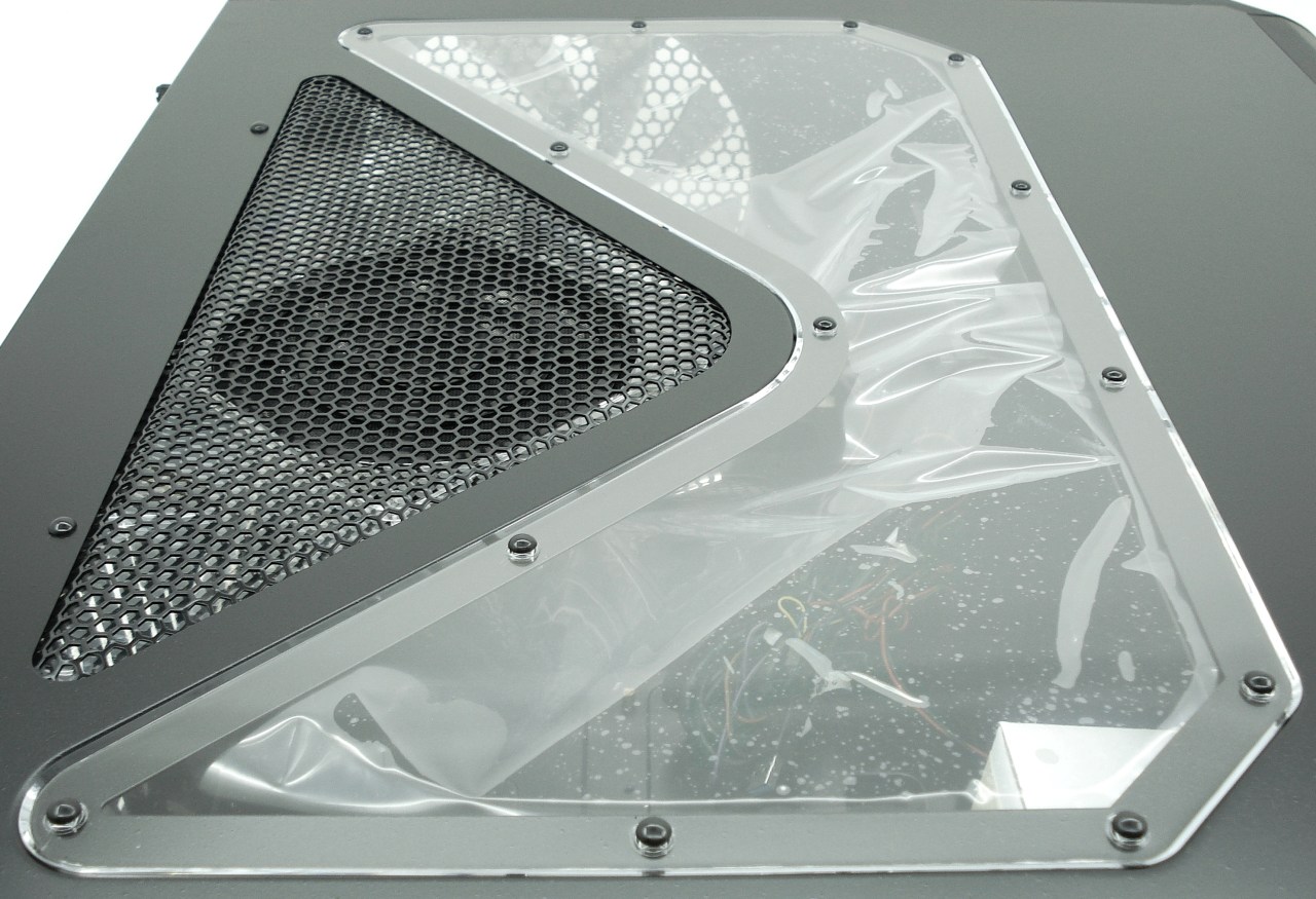 Aquí encontramos 2 materiales distinguibles para cubrir todo el ventanal abierto a la vista del lateral izquierdo. En primer lugar, tenemos una ventana de metacrilato totalmente transparente, unida al laminado de acero por varias cabezas negras con tornillos. En segundo lugar, tenemos una rejilla metálica triangular con perforaciones hexagonales tapada por otra ventana de metacrilato trasera. En el centro del triángulo, se sitúa una estructura de plástico ABS transparente para poder acoplar un ventilador de 12cm no incluido. Esta estructura posee una carril para contener un filtro anti polvo incluido, extraíble y lavable. Con todo ello, el lateral izquierdo queda totalmente tapado, algo que interesa y mucho.