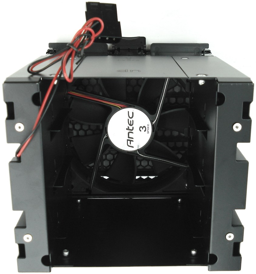 ANTEC TWELVE HUNDRED V3. Detalle compartimento de 3 bahías de 3.5″ desmontable II. Ventilador Antec TriCool 12cm con LEDs azules