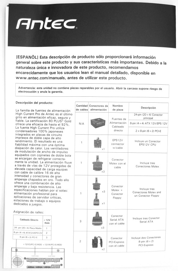 En el folleto se detallan los conectores que ofrece la fuente, así como a qué raíles de +12V pertenecen, cosa que generalmente echamos de menos que se nos informe por parte de otros fabricantes. Así, conocemos de antemano a qué raíl de +12V pertenece cada cableado, recordamos que posee 4 raíles.