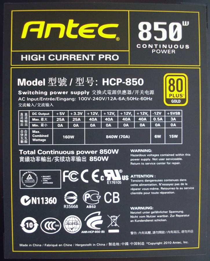 Además, como no, vemos la marca «ANTEC», modelo «HCP-850» y potencia de 850W, su sello de certificación 80 PLUS Gold, así como una advertencia de seguridad prohibiendo abrir la unidad por motivos obvios. Por último, podemos ver la cantidad de sellos referentes a normativa y seguridad que ha cumplido esta fuente antes de salir al mercado, que no son pocos. Cada vez que queramos adquirir uno de estos productos, hace falta fijarnos en estas cosas. Como ya hemos dicho, está fabricada en China a finales del 2010.
