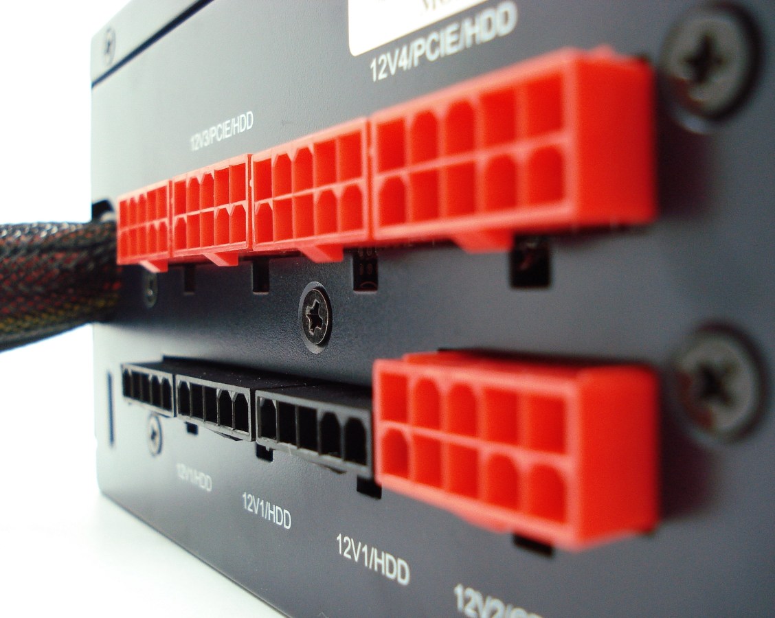 Este panel es peculiar por permitir la conexión segura de los molex negros del cableado modular con los conectores rojos del panel. Esto permite una flexibilidad aún mayor a la hora de conectar cada cableado como nos dé la gana. Esta es una gran ventaja que pocos paneles de conexiones poseen a día de hoy, con el añadido de que conocemos cada conector a qué raíl pertenece. Además de la gran seguridad que otorga una panel de hasta 4 raíles independientes de +12V, podremos equilibrar la relación entre la fuente y todos los dispositivos que alimente, logrando que cada raíl entre en carga lo mínimo posible, siendo esta forma de conectar la más adecuada, empleando el máximo de conectores necesario para que todos los raíles trabajen en el peor de los casos. Tan solo hará falta calcular aproximadamente la potencia que consume cada dispositivo y repartirla observando el número en cola de cada raíl, por ejemplo: el raíl 3 es el perteneciente al nombre 12V3, con el número 3 en la cola.