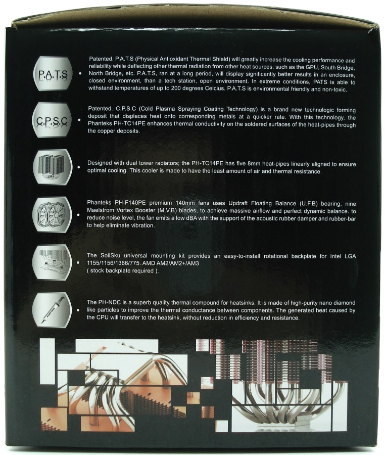 «El diseño de disipador de doble torre de Phanteks PH-TC14PE utiliza la tecnología aeroespacial más actual. El uso de P.A.T.S. para aumentar el rendimiento de refrigeración y la tecnología C.P.S.C. para mejorar la conductividad térmica, disipará fácilmente el calor y permitirá aumentar aún más la velocidad del reloj. Junto con los ventiladores duales Phanteks PH-F140PE Premium de 14o mm, el kit de montaje SoliSku de fácil instalación y el compuesto térmico PH-NDC, el disipador Phanteks PH-TC14 de colores exclusivos está estableciendo el nuevo estándar de la refrigeración de CPU de hoy en día.«