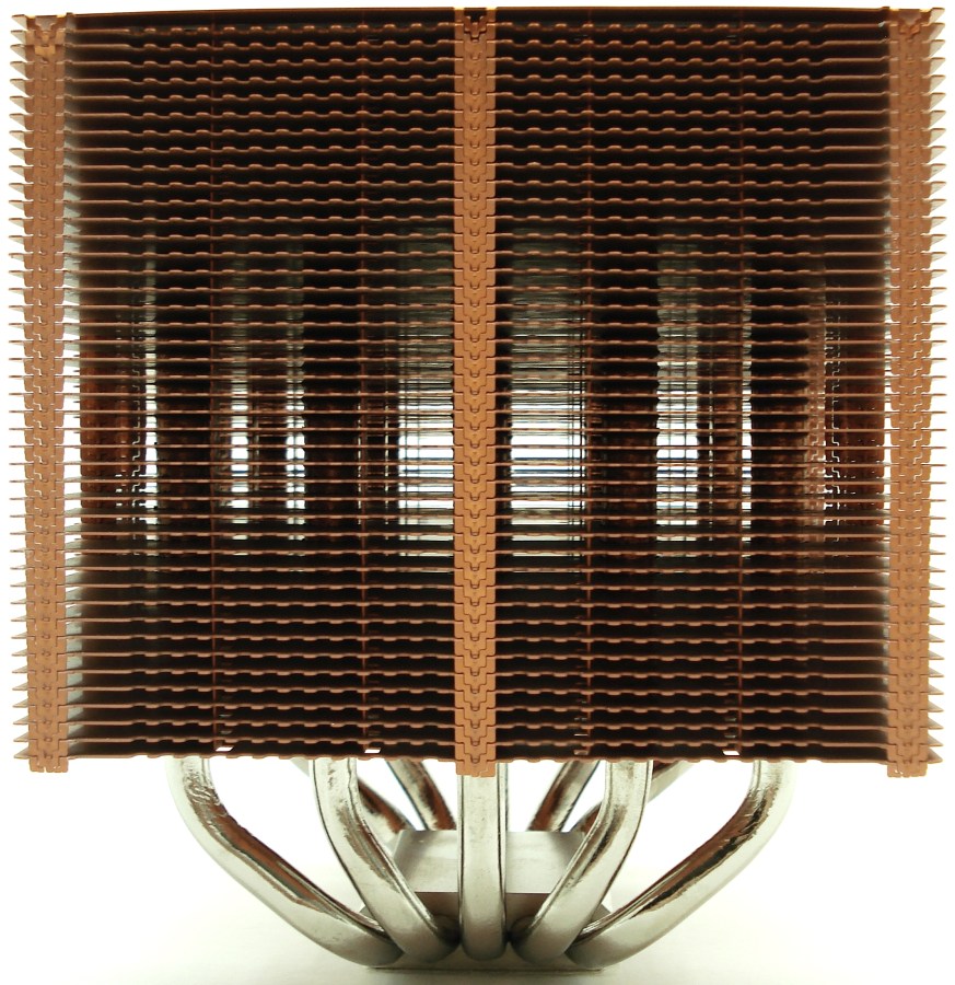 Lo siguiente a destacar, es que ese tipo de disipador admite, tal como ya hemos dicho 3 ventiladores de 14cm (o incluso más pequeños). Se emplean 5 tubos de cobre en forma de U y ramificados abiertamente imitando a un árbol. La distancia entre los tubos en línea es equidistante, aprovechando en la medida de lo posible toda la anchura de las láminas.