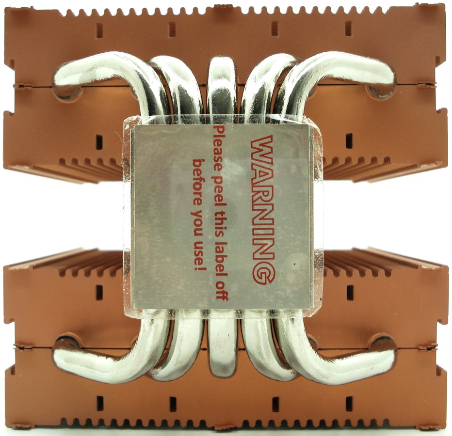 La base, también de cobre, viene protegida por un plástico adhesivo para evitar fricciones y acumule de grasa de las manos. Más adelanta la veremos con mayor detalle. El funcionamiento básicamente es el de siempre: el procesador (CPU) se calienta en funcionamiento, a través del compuesto térmico trasmite la temperatura por conducción a la base de cobre. Ésta trasmite la temperatura a los tubos de cobre, y éstos la esparcen y trasmiten a todas las láminas de aluminio. De modo que una superficie tan pequeña como la que ocupa la cara superior de un procesador, se convierte en una enorme superficie sumada de todos estas partes nombradas. Los ventiladores refrescan las aletas y entramos en el proceso inverso por todo el recorrido del disipador. De manera que el sistema encuentra un equilibrio entre temperatura alta y baja.