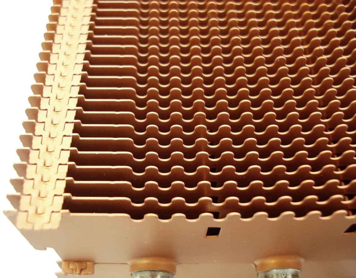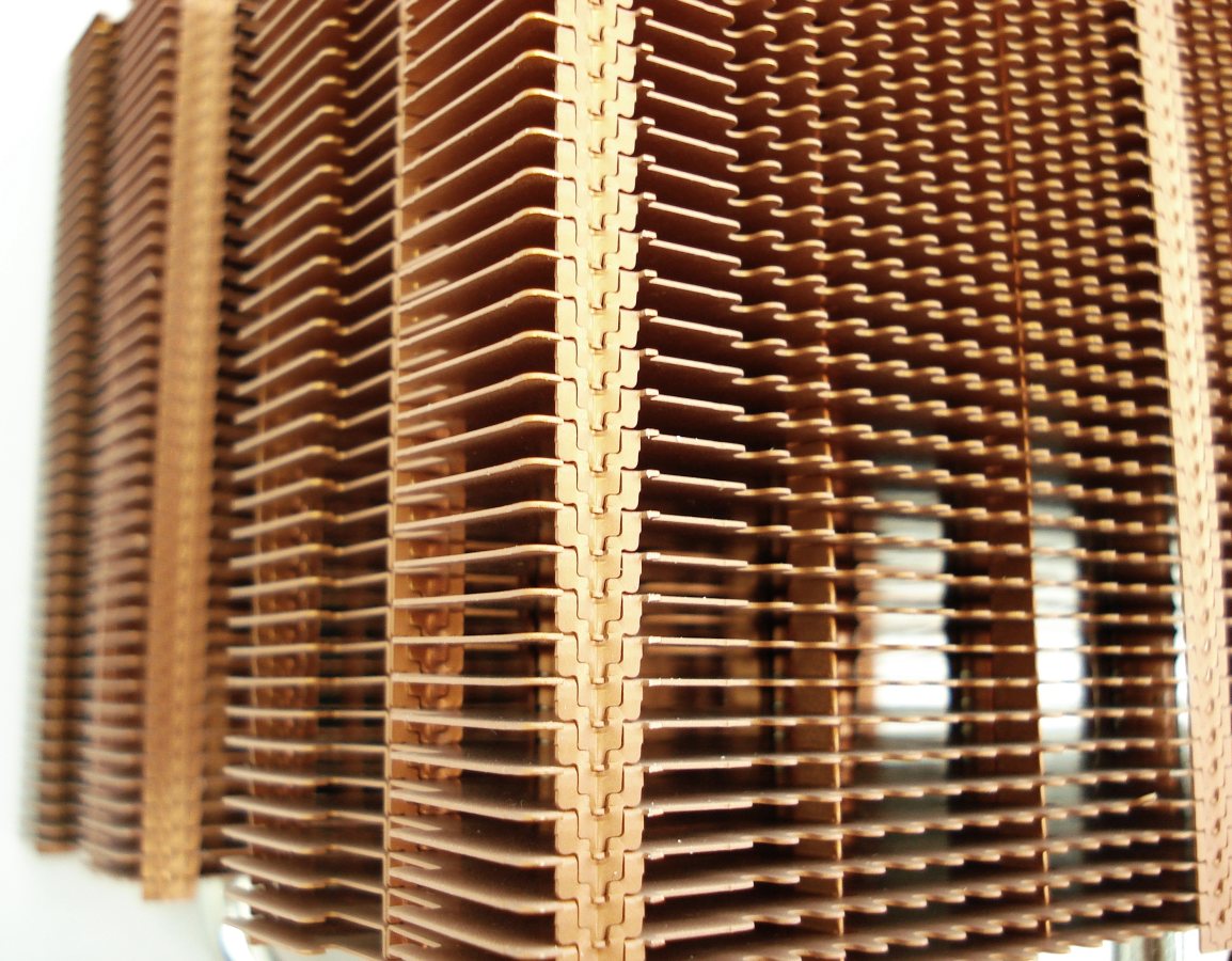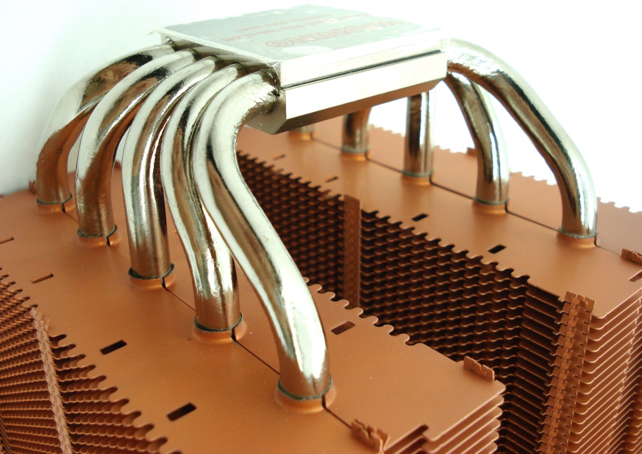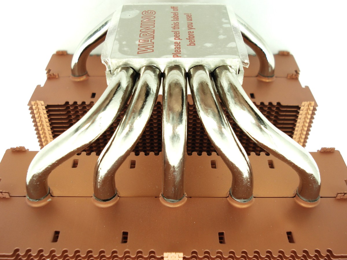 Los tubos de cobre o heat-pipes, están todos recubiertos con una pequeña capa de niquel y plata, dando este tono plateado brillante. Este método se emplea para evitar el mal aspecto ennegrecido que sufre el material de cobre al oxidarse. Gracias a la maleabilidad del material de cobre, se puede doblar fácilmente para lograr esta forma ramificada. Se nota que se ha estudiado la distancia entre cada tubo, para así ocupar mayor área. De modo que se aprovecha al máximo en anchura y en altitud. Las dimensiones del disipador en general están muy bien aprovechadas.
