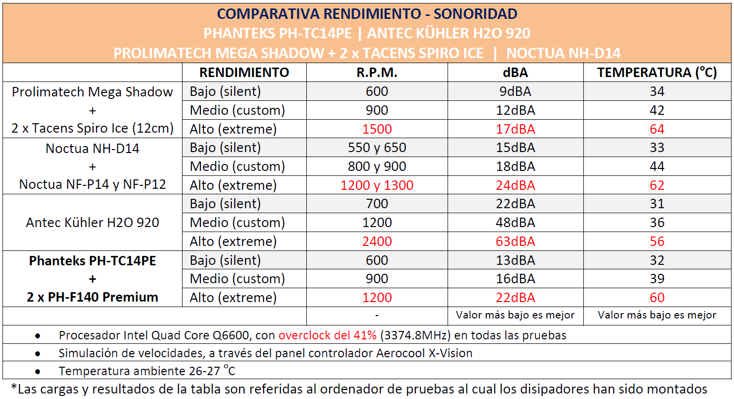 PHANTEKS PH-TC14PE_OR. Tabla Comparativa de Rendimiento con Mega Shadow, NH-D14 y Kühler H2O 920
