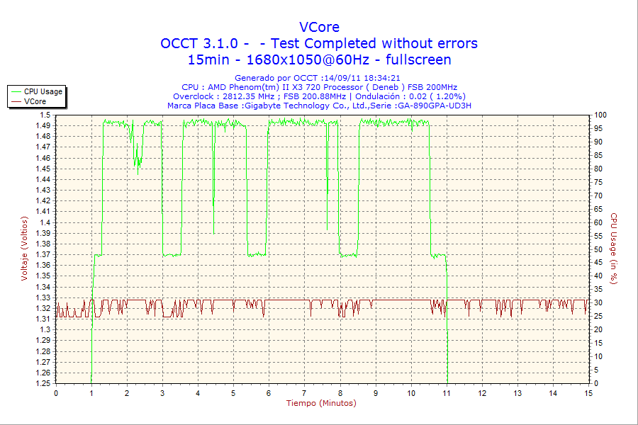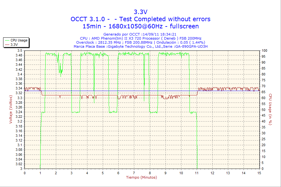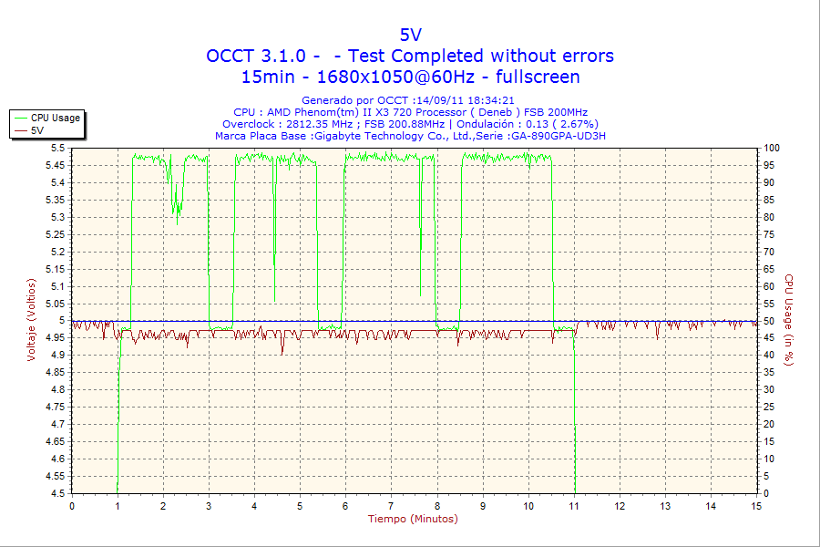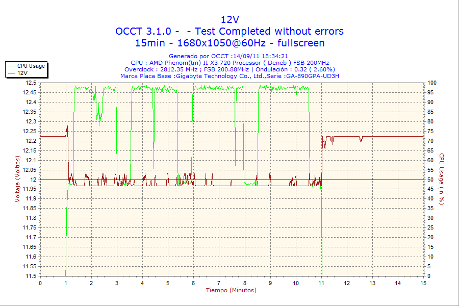 Hemos realizado nuestra prueba de 15 minutos para determinar la estabilidad por software de nuestra fuente de pruebas. En este caso, al disponer de un solo raíl de +12V, el OCCT nos vendrá más que pintado para ver todos los gráficos. A ver qué tal…