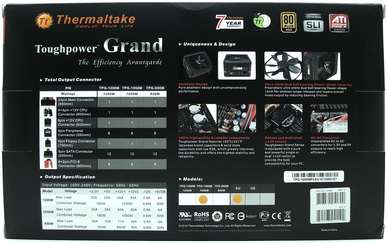 La parte trasera, completa el resto de características de este modelo, también únicamente en el idioma inglés, con diferentes breves descripciones y viñetas. Se detalla una tabla del número y tipo de conectores, junto a una tabla de las especificaciones técnicas de corriente de salida. Como hemos dicho, este tipo de embalaje sirve para los 3 modelos citados anteriormente, estando marcado el modelo TPG-1050M, de 1050W garantizados de potencia continua de salida, versión EU. Este producto está diseñado por Thermaltake en el 2010, fabricado en China y disponible a principios de este mismo año 2011. Cumple con varias normativas, RoHS, CE FC, etc, quedando respaldada con 7 años de garantía, ahí es nada.